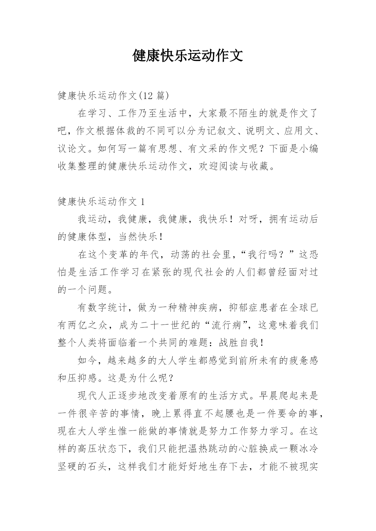 健康快乐运动作文健康快乐运动作文(12篇)在学习、工作乃至生活中,大家最不陌生的就是作文了吧,作文根据体裁的不同可以分为记叙文、说明文、应用文、议论文。如何写一篇有思想、有文采的作文呢?下面是小编收集整理的健康快乐运动作文,欢迎阅读与收藏。健康快乐运动作文1我运动,我健康,我健康,我快乐!对呀,拥有运动后的健康体型,当然快乐!在这个变革的年代,动荡的社会里,“我行吗?”这恐怕是生活工作学习在紧张的现代社会的人们都曾经面对过的一个问题。有数字统计,做为一种精神疾病,抑郁症患者在全球已有两亿之众,成为二十一世