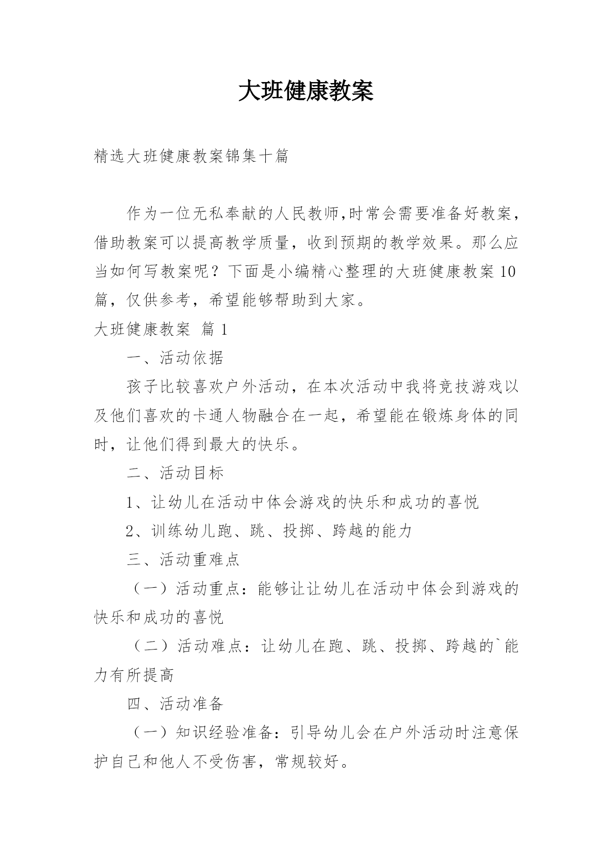 大班健康教案精选大班健康教案锦集十篇作为一位无私奉献的人民教师,时常会需要准备好教案,借助教案可以提高教学质量,收到预期的教学效果。那么应当如何写教案呢?下面是小编精心整理的大班健康教案10篇,仅供参考,希望能够帮助到大家。大班健康教案篇1一、活动依据孩子比较喜欢户外活动,在本次活动中我将竞技游戏以及他们喜欢的卡通人物融合在一起,希望能在锻炼身体的同时,让他们得到最大的快乐。二、活动目标1、让幼儿在活动中体会游戏的快乐和成功的喜悦2、训练幼儿跑、跳、投掷、跨越的能力三、活动重难点(一)活动重点:能够让让幼