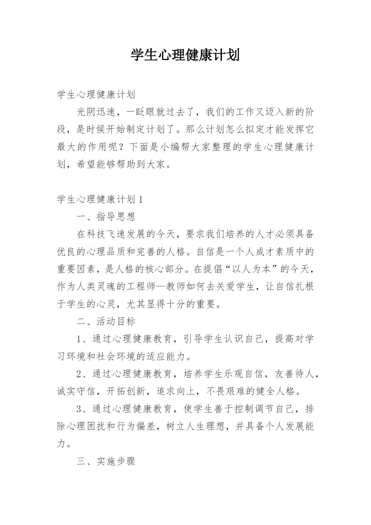 学生心理健康计划学生心理健康计划光阴迅速,一眨眼就过去了,我们的工作又迈入新的阶段,是时候开始制定计划了。那么计划怎么拟定才能发挥它最大的作用呢?下面是小编帮大家整理的学生心理健康计划,希望能够帮助到大家。学生心理健康计划1一、指导思想在科技飞速发展的今天,要求我们培养的人才必须具备优良的心理品质和完善的人格。自信是一个人成才素质中的重要因素,是人格的核心部分。在提倡“以人为本”的今天,作为人类灵魂的工程师—教师如何去关爱学生,让自信扎根于学生的心灵,尤其显得十分的重要。二、活动目标1、通过心理健康教育,