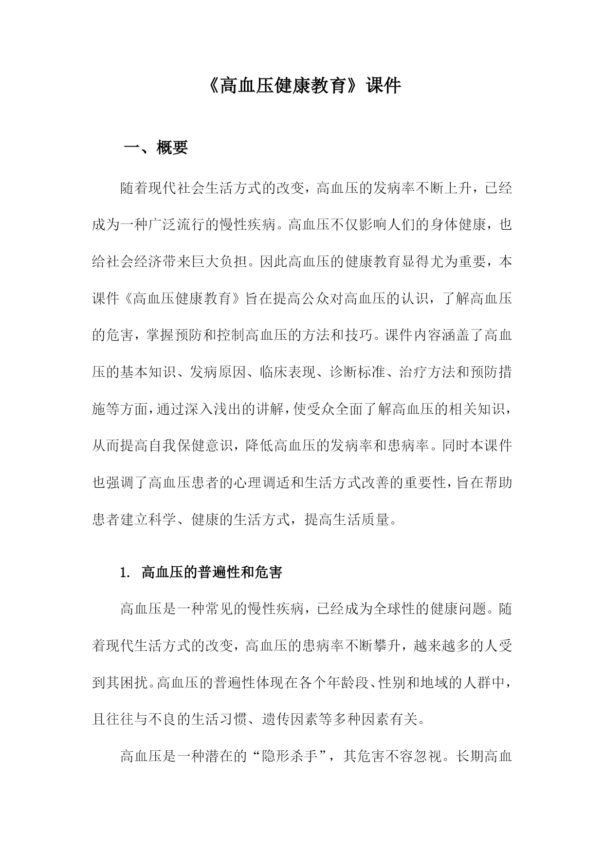 《高血压健康教育》课件一、概要随着现代社会生活方式的改变,高血压的发病率不断上升,已经成为一种广泛流行的慢性疾病。高血压不仅影响人们的身体健康,也给社会经济带来巨大负担。因此高血压的健康教育显得尤为重要,本课件《高血压健康教育》旨在提高公众对高血压的认识,了解高血压的危害,掌握预防和控制高血压的方法和技巧。课件内容涵盖了高血压的基本知识、发病原因、临床表现、诊断标准、治疗方法和预防措施等方面,通过深入浅出的讲解,使受众全面了解高血压的相关知识,从而提高自我保健意识,降低高血压的发病率和患病率。同时本课件也