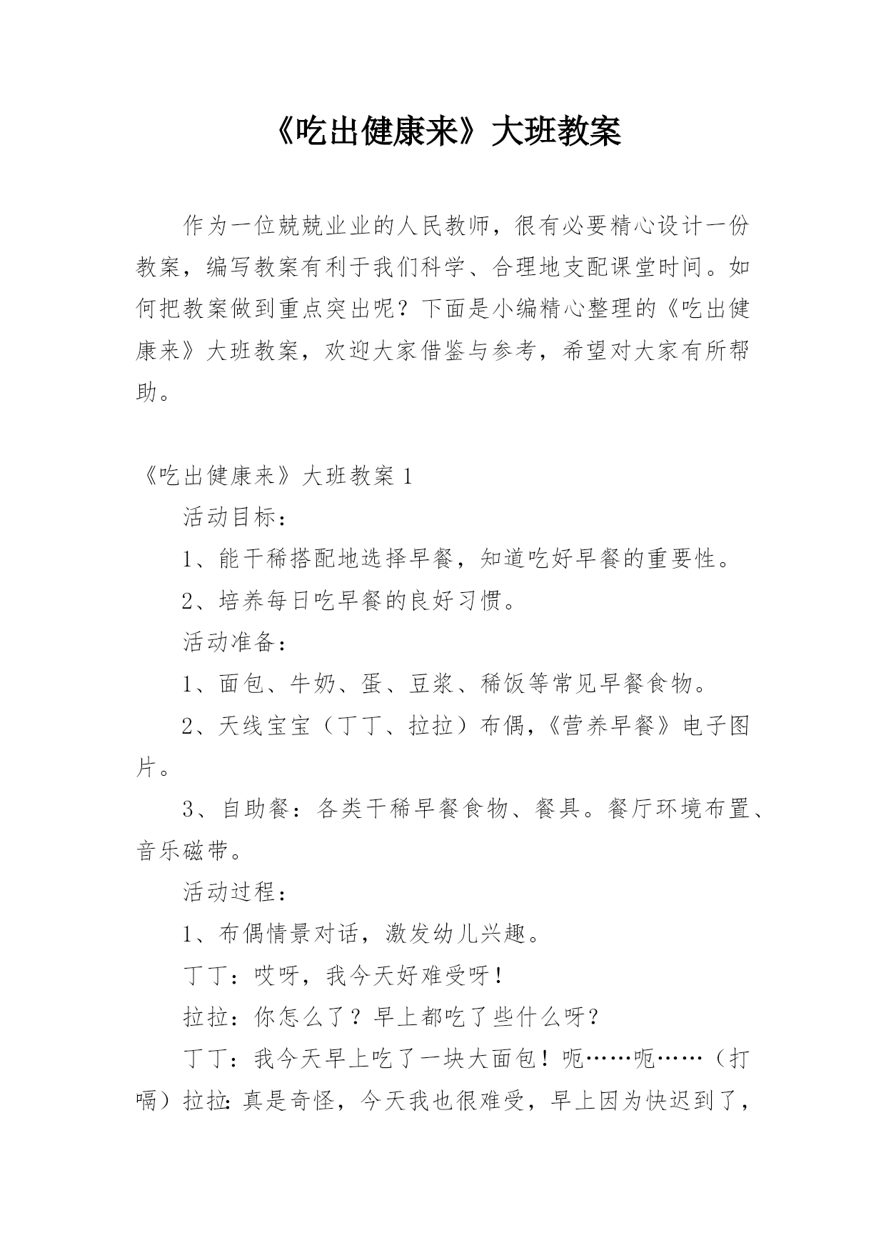 《吃出健康来》大班教案作为一位兢兢业业的人民教师,很有必要精心设计一份教案,编写教案有利于我们科学、合理地支配课堂时间。如何把教案做到重点突出呢?下面是小编精心整理的《吃出健康来》大班教案,欢迎大家借鉴与参考,希望对大家有所帮助。《吃出健康来》大班教案1活动目标:1、能干稀搭配地选择早餐,知道吃好早餐的重要性。2、培养每日吃早餐的良好习惯。活动准备:1、面包、牛奶、蛋、豆浆、稀饭等常见早餐食物。2、天线宝宝(丁丁、拉拉)布偶,《营养早餐》电子图片。3、自助餐:各类干稀早餐食物、餐具。餐厅环境布置、音乐磁带