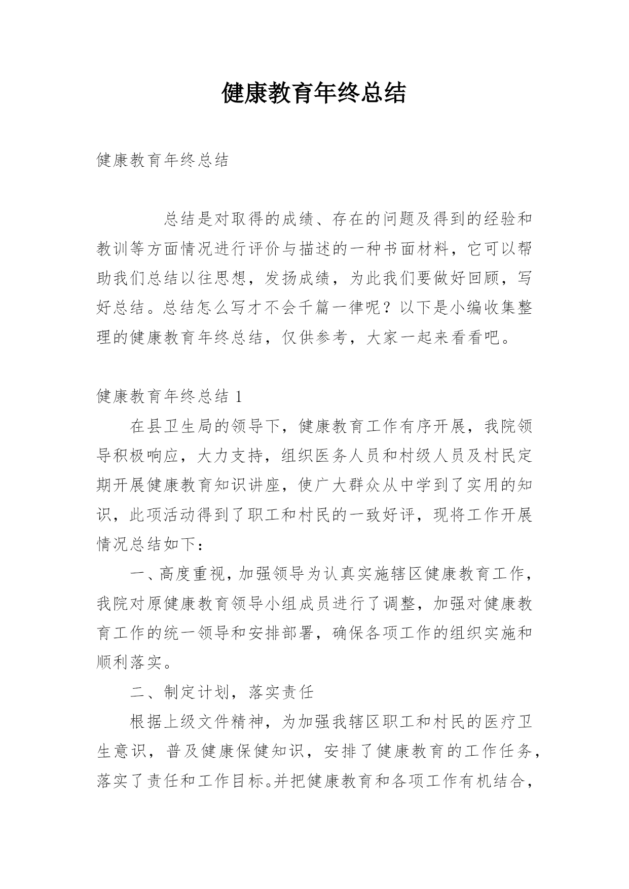 健康教育年终总结健康教育年终总结总结是对取得的成绩、存在的问题及得到的经验和教训等方面情况进行评价与描述的一种书面材料,它可以帮助我们总结以往思想,发扬成绩,为此我们要做好回顾,写好总结。总结怎么写才不会千篇一律呢?以下是小编收集整理的健康教育年终总结,仅供参考,大家一起来看看吧。健康教育年终总结1在县卫生局的领导下,健康教育工作有序开展,我院领导积极响应,大力支持,组织医务人员和村级人员及村民定期开展健康教育知识讲座,使广大群众从中学到了实用的知识,此项活动得到了职工和村民的一致好评,现将工作开展情况总