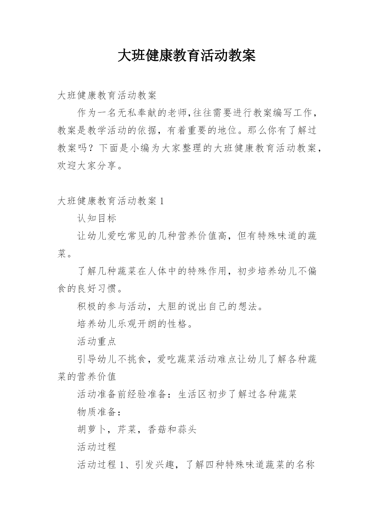 大班健康教育活动教案大班健康教育活动教案作为一名无私奉献的老师,往往需要进行教案编写工作,教案是教学活动的依据,有着重要的地位。那么你有了解过教案吗?下面是小编为大家整理的大班健康教育活动教案,欢迎大家分享。大班健康教育活动教案1认知目标让幼儿爱吃常见的几种营养价值高,但有特殊味道的蔬菜。了解几种蔬菜在人体中的特殊作用,初步培养幼儿不偏食的良好习惯。积极的参与活动,大胆的说出自己的想法。培养幼儿乐观开朗的性格。活动重点引导幼儿不挑食,爱吃蔬菜活动难点让幼儿了解各种蔬菜的营养价值活动准备前经验准备:生活区初