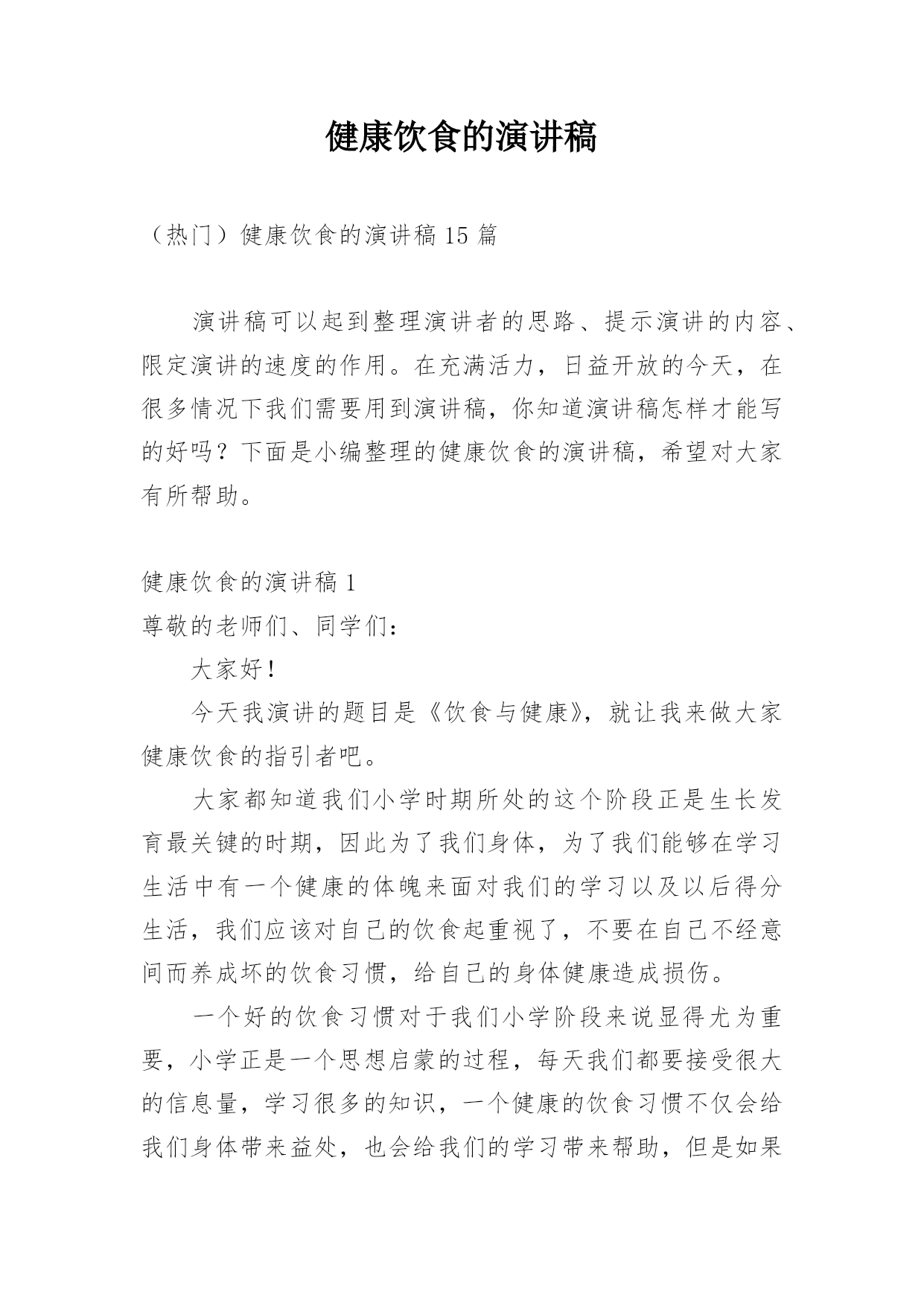 健康饮食的演讲稿(热门)健康饮食的演讲稿15篇演讲稿可以起到整理演讲者的思路、提示演讲的内容、限定演讲的速度的作用。在充满活力,日益开放的今天,在很多情况下我们需要用到演讲稿,你知道演讲稿怎样才能写的好吗?下面是小编整理的健康饮食的演讲稿,希望对大家有所帮助。健康饮食的演讲稿1尊敬的老师们、同学们:大家好!今天我演讲的题目是《饮食与健康》,就让我来做大家健康饮食的指引者吧。大家都知道我们小学时期所处的这个阶段正是生长发育最关键的时期,因此为了我们身体,为了我们能够在学习生活中有一个健康的体魄来面对我们的学