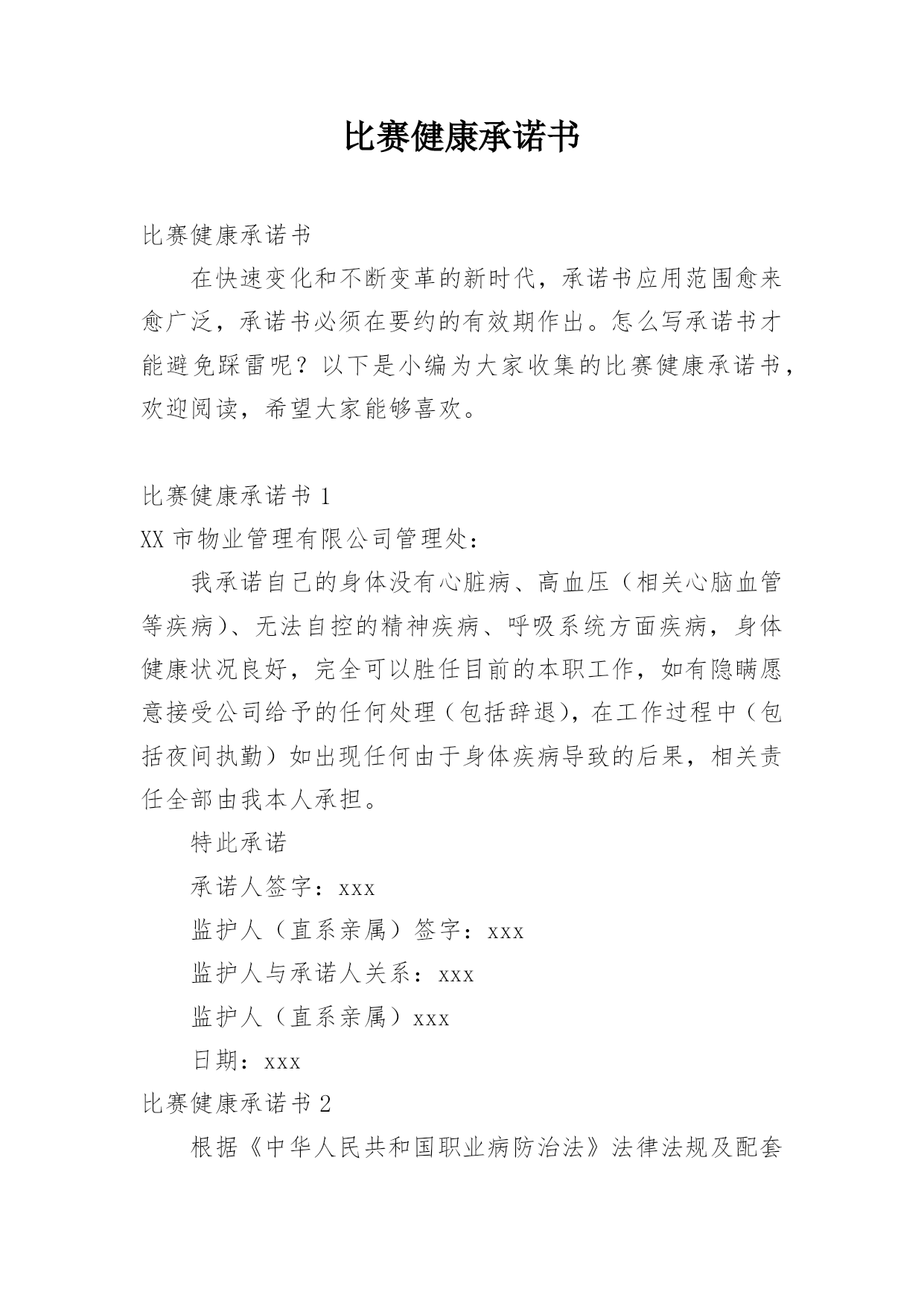 比赛健康承诺书比赛健康承诺书在快速变化和不断变革的新时代,承诺书应用范围愈来愈广泛,承诺书必须在要约的有效期作出。怎么写承诺书才能避免踩雷呢?以下是小编为大家收集的比赛健康承诺书,欢迎阅读,希望大家能够喜欢。比赛健康承诺书1XX市物业管理有限公司管理处:我承诺自己的身体没有心脏病、高血压(相关心脑血管等疾病)、无法自控的精神疾病、呼吸系统方面疾病,身体健康状况良好,完全可以胜任目前的本职工作,如有隐瞒愿意接受公司给予的任何处理(包括辞退),在工作过程中(包括夜间执勤)如出现任何由于身体疾病导致的后果,相关