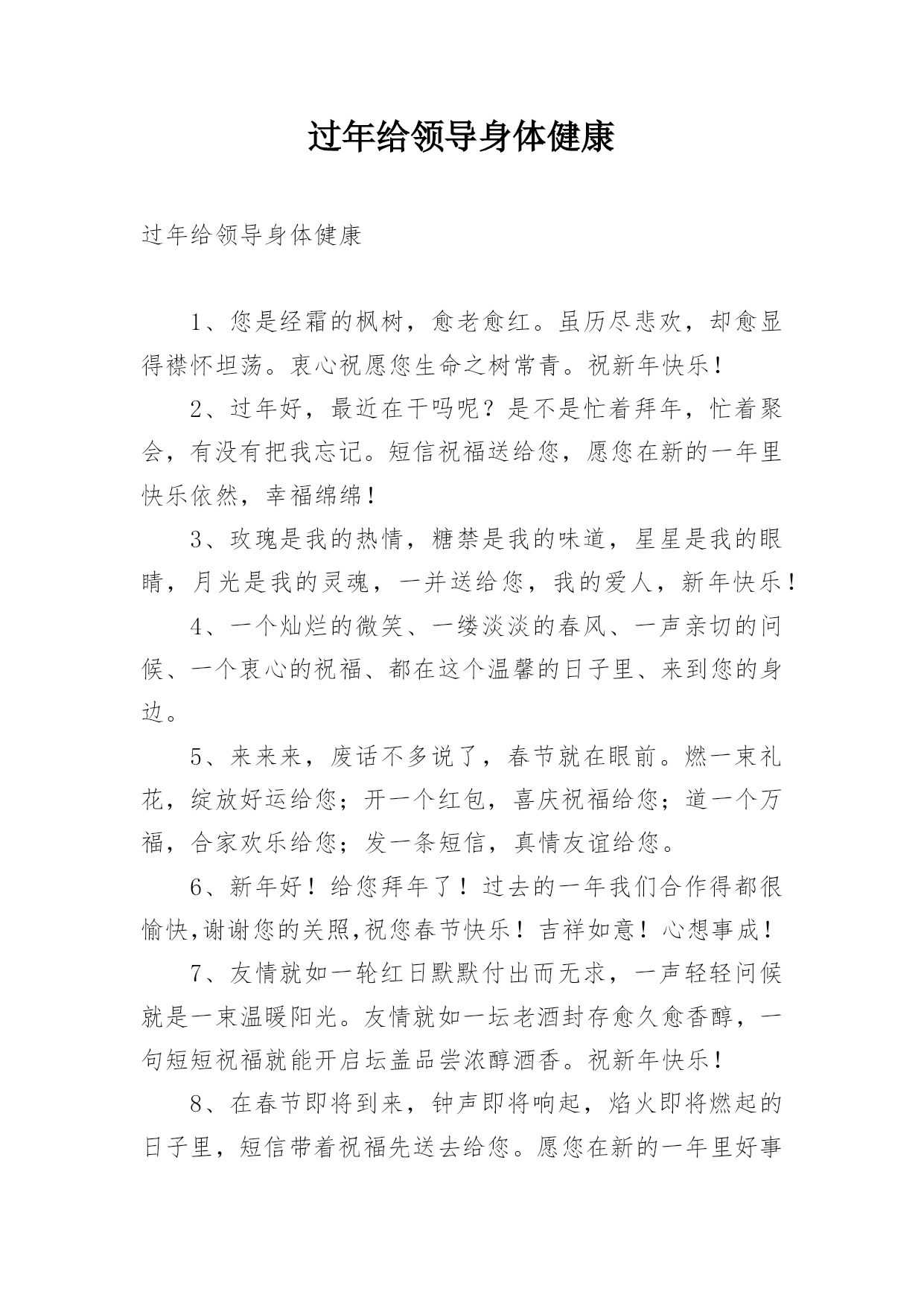 过年给领导身体健康过年给领导身体健康1、您是经霜的枫树,愈老愈红。虽历尽悲欢,却愈显得襟怀坦荡。衷心祝愿您生命之树常青。祝新年快乐!2、过年好,最近在干吗呢?是不是忙着拜年,忙着聚会,有没有把我忘记。短信祝福送给您,愿您在新的一年里快乐依然,幸福绵绵!3、玫瑰是我的热情,糖禁是我的味道,星星是我的眼睛,月光是我的灵魂,一并送给您,我的爱人,新年快乐!4、一个灿烂的微笑、一缕淡淡的春风、一声亲切的问候、一个衷心的祝福、都在这个温馨的日子里、来到您的身边。5、来来来,废话不多说了,春节就在眼前。燃一束礼花,绽