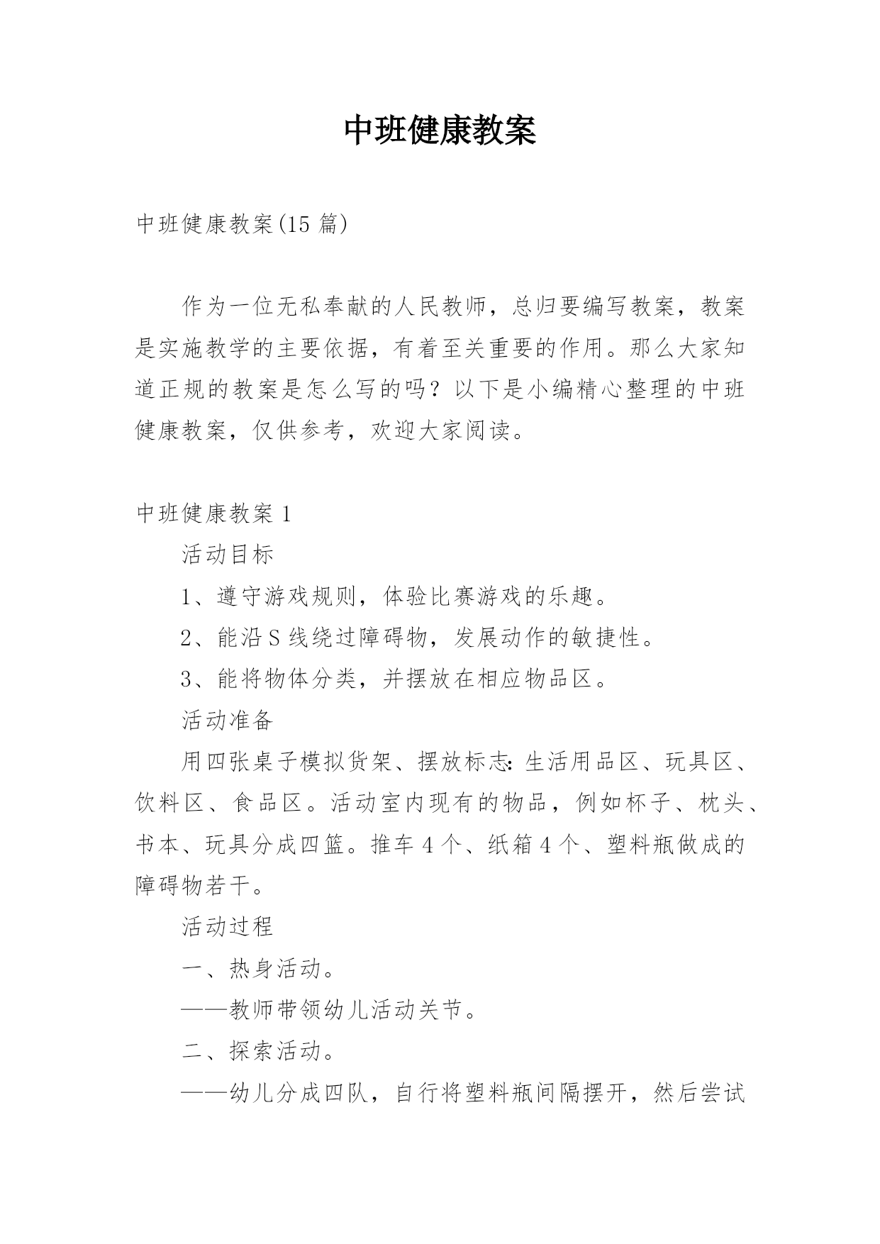 中班健康教案中班健康教案(15篇)作为一位无私奉献的人民教师,总归要编写教案,教案是实施教学的主要依据,有着至关重要的作用。那么大家知道正规的教案是怎么写的吗?以下是小编精心整理的中班健康教案,仅供参考,欢迎大家阅读。中班健康教案1活动目标1、遵守游戏规则,体验比赛游戏的乐趣。2、能沿S线绕过障碍物,发展动作的敏捷性。3、能将物体分类,并摆放在相应物品区。活动准备用四张桌子模拟货架、摆放标志:生活用品区、玩具区、饮料区、食品区。活动室内现有的物品,例如杯子、枕头、书本、玩具分成四篮。推车4个、纸箱4个、塑