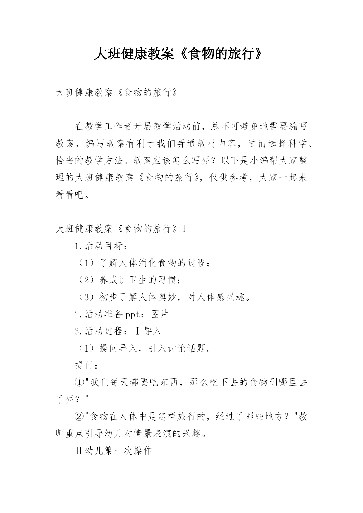 大班健康教案《食物的旅行》大班健康教案《食物的旅行》在教学工作者开展教学活动前,总不可避免地需要编写教案,编写教案有利于我们弄通教材内容,进而选择科学、恰当的教学方法。教案应该怎么写呢?以下是小编帮大家整理的大班健康教案《食物的旅行》,仅供参考,大家一起来看看吧。大班健康教案《食物的旅行》11.活动目标:(1)了解人体消化食物的过程;(2)养成讲卫生的习惯;(3)初步了解人体奥妙,对人体感兴趣。2.活动准备ppt:图片3.活动过程:Ⅰ导入(1)提问导入,引入讨论话题。提问:①"我们每天都要吃东西,那么吃下