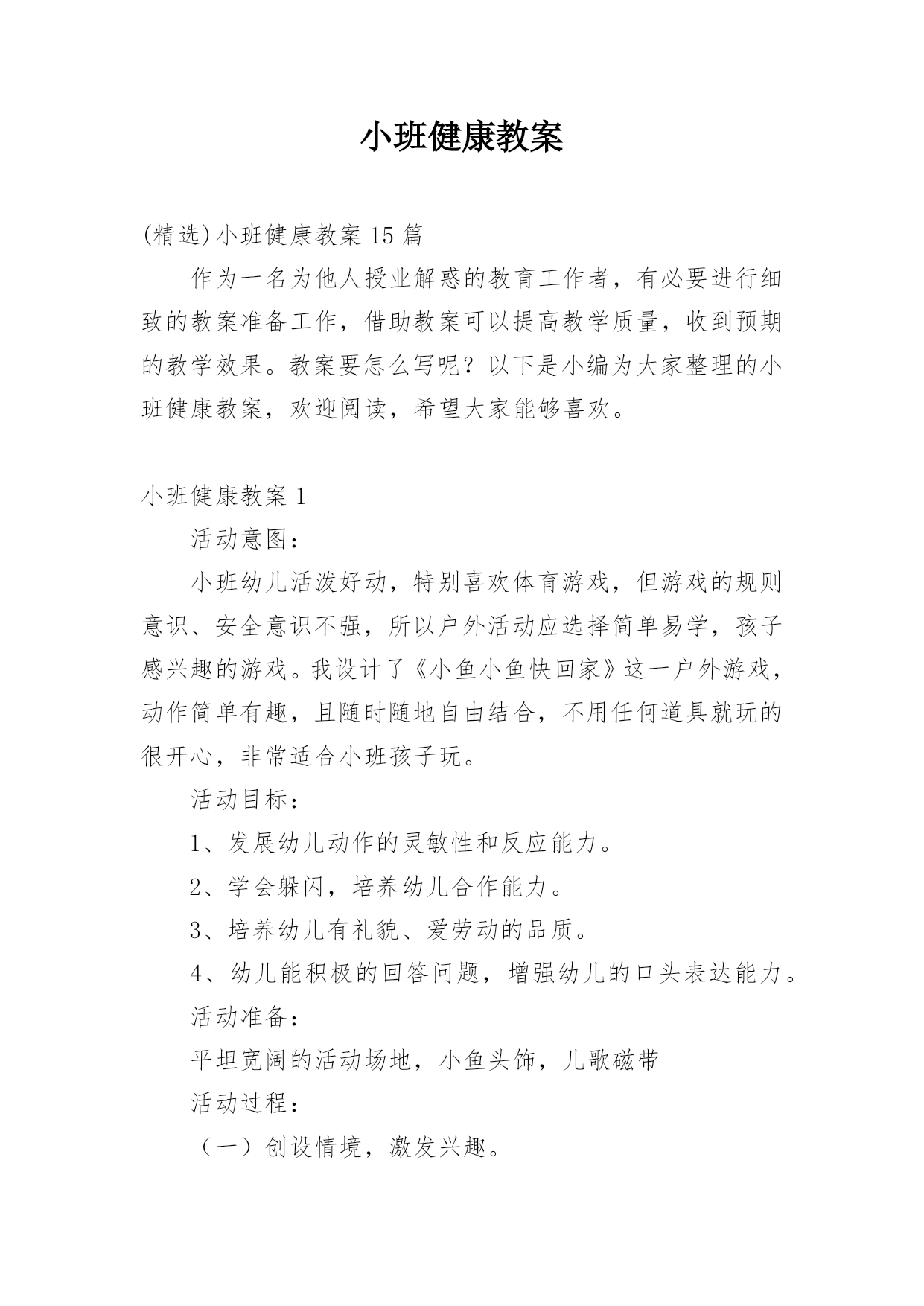 小班健康教案(精选)小班健康教案15篇作为一名为他人授业解惑的教育工作者,有必要进行细致的教案准备工作,借助教案可以提高教学质量,收到预期的教学效果。教案要怎么写呢?以下是小编为大家整理的小班健康教案,欢迎阅读,希望大家能够喜欢。小班健康教案1活动意图:小班幼儿活泼好动,特别喜欢体育游戏,但游戏的规则意识、安全意识不强,所以户外活动应选择简单易学,孩子感兴趣的游戏。我设计了《小鱼小鱼快回家》这一户外游戏,动作简单有趣,且随时随地自由结合,不用任何道具就玩的很开心,非常适合小班孩子玩。活动目标:1、发展幼儿