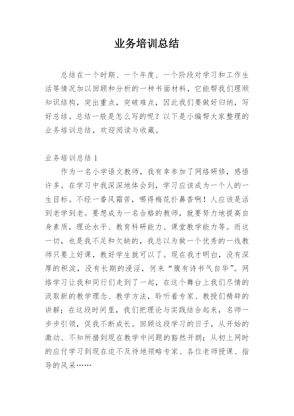 业务培训总结总结在一个时期、一个年度、一个阶段对学习和工作生活等情况加以回顾和分析的一种书面材料,它能帮我们理顺知识结构,突出重点,突破难点,因此我们要做好归纳,写好总结。总结一般是怎么写的呢?以下是小编帮大家整理的业务培训总结,欢迎阅读与收藏。业务培训总结1作为一名小学语文教师,我有幸参加了网络研修,感悟许多。在学习中我深深地体会到,学习应该成为一个人的一生目标。不经一番风霜苦,哪得梅花扑鼻香啊!人应该是活到老学到老。要想成为一名合格的教师,就要努力地提高自身素质,理论水平、教育科研能力、课堂教学能力等