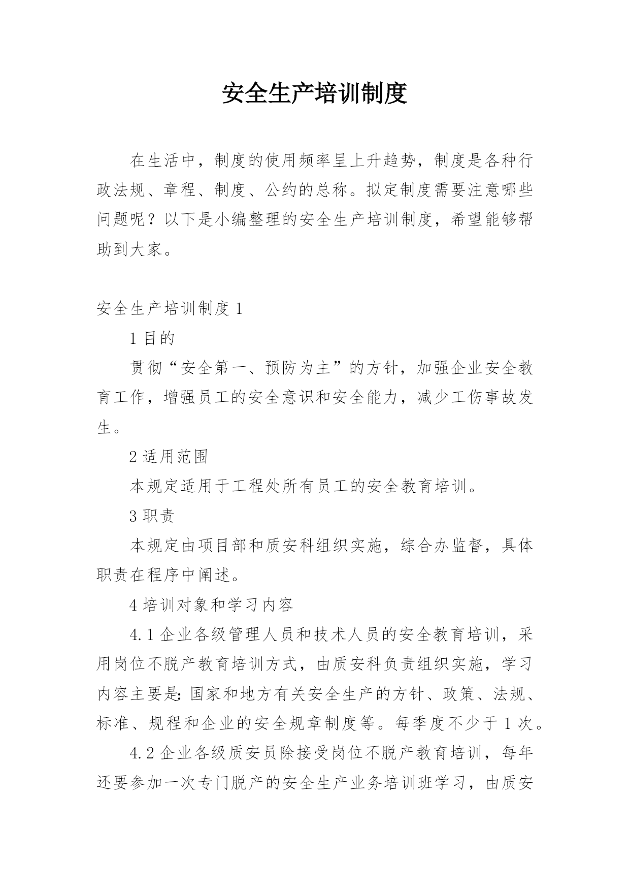 安全生产培训制度在生活中,制度的使用频率呈上升趋势,制度是各种行政法规、章程、制度、公约的总称。拟定制度需要注意哪些问题呢?以下是小编整理的安全生产培训制度,希望能够帮助到大家。安全生产培训制度11目的贯彻“安全第一、预防为主”的方针,加强企业安全教育工作,增强员工的安全意识和安全能力,减少工伤事故发生。2适用范围本规定适用于工程处所有员工的安全教育培训。3职责本规定由项目部和质安科组织实施,综合办监督,具体职责在程序中阐述。4培训对象和学习内容4.1企业各级管理人员和技术人员的安全教育培训,采用岗位不脱