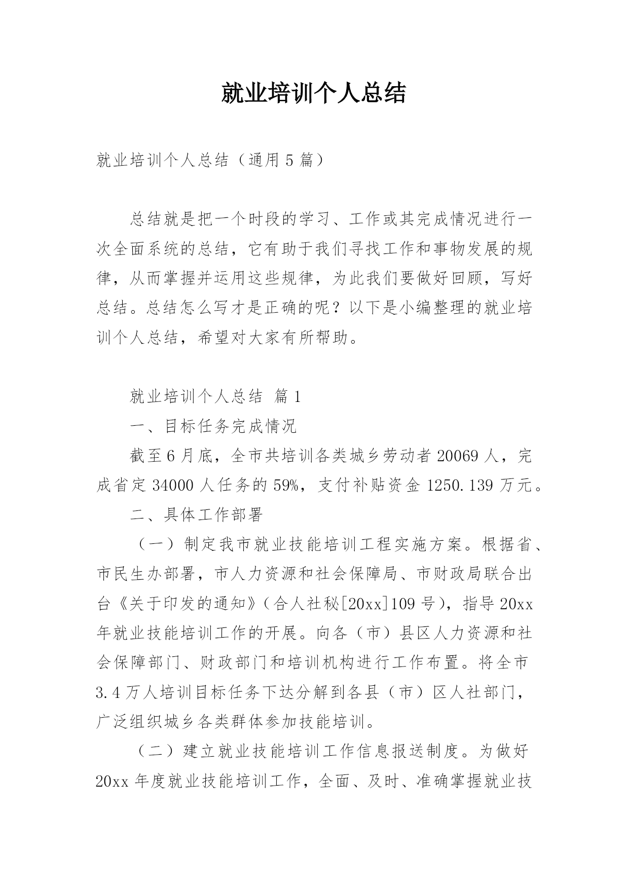 就业培训个人总结就业培训个人总结(通用5篇)总结就是把一个时段的学习、工作或其完成情况进行一次全面系统的总结,它有助于我们寻找工作和事物发展的规律,从而掌握并运用这些规律,为此我们要做好回顾,写好总结。总结怎么写才是正确的呢?以下是小编整理的就业培训个人总结,希望对大家有所帮助。就业培训个人总结篇1一、目标任务完成情况截至6月底,全市共培训各类城乡劳动者20069人,完成省定34000人任务的59%,支付补贴资金1250.139万元。二、具体工作部署(一)制定我市就业技能培训工程实施方案。根据省、市民生办