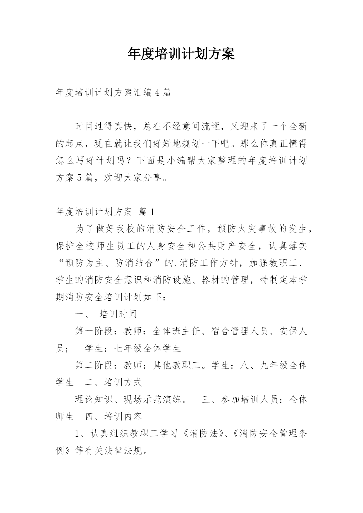 年度培训计划方案年度培训计划方案汇编4篇时间过得真快,总在不经意间流逝,又迎来了一个全新的起点,现在就让我们好好地规划一下吧。那么你真正懂得怎么写好计划吗?下面是小编帮大家整理的年度培训计划方案5篇,欢迎大家分享。年度培训计划方案篇1为了做好我校的消防安全工作,预防火灾事故的发生,保护全校师生员工的人身安全和公共财产安全,认真落实“预防为主、防消结合”的.消防工作方针,加强教职工、学生的消防安全意识和消防设施、器材的管理,特制定本学期消防安全培训计划如下:一、培训时间第一阶段:教师:全体班主任、宿舍管理人