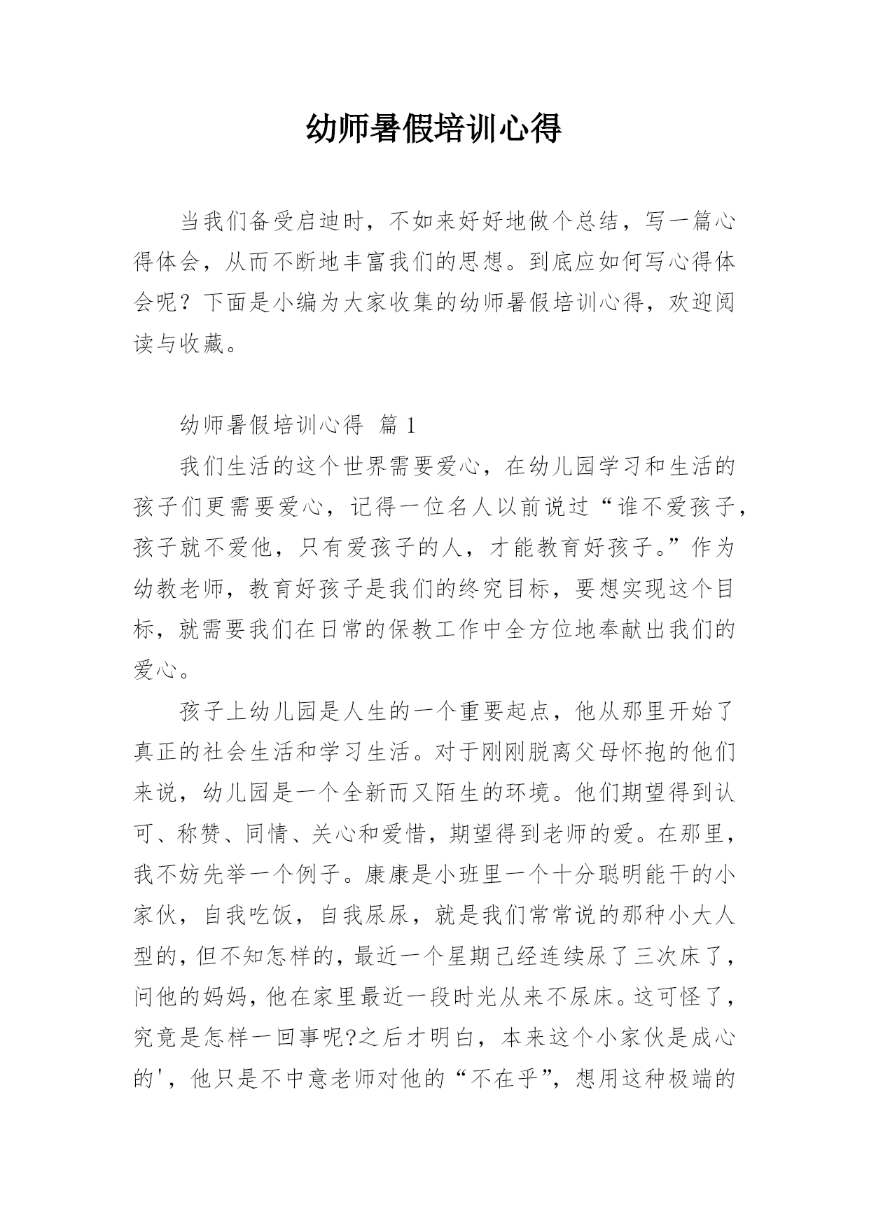 幼师暑假培训心得当我们备受启迪时,不如来好好地做个总结,写一篇心得体会,从而不断地丰富我们的思想。到底应如何写心得体会呢?下面是小编为大家收集的幼师暑假培训心得,欢迎阅读与收藏。幼师暑假培训心得篇1我们生活的这个世界需要爱心,在幼儿园学习和生活的孩子们更需要爱心,记得一位名人以前说过“谁不爱孩子,孩子就不爱他,只有爱孩子的人,才能教育好孩子。”作为幼教老师,教育好孩子是我们的终究目标,要想实现这个目标,就需要我们在日常的保教工作中全方位地奉献出我们的爱心。孩子上幼儿园是人生的一个重要起点,他从那里开始了真