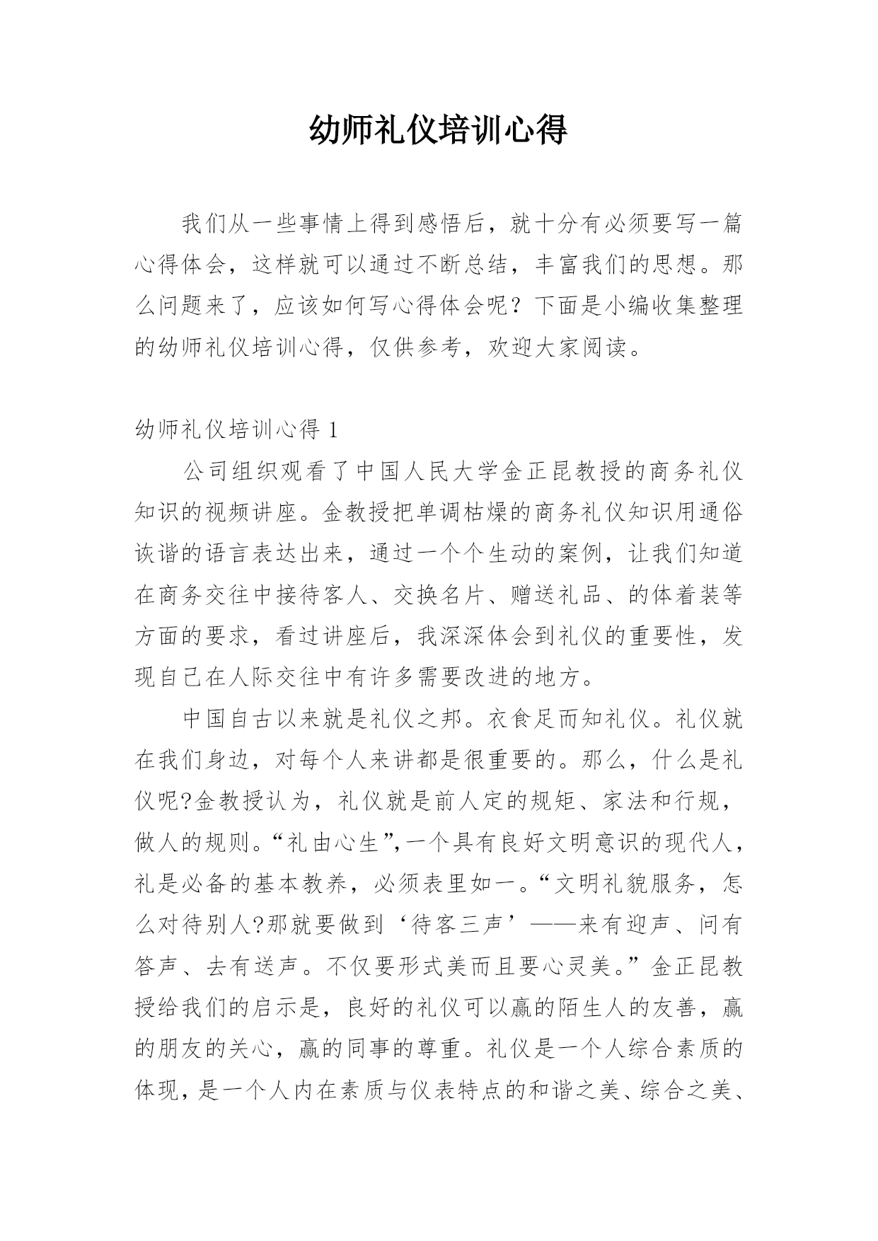 幼师礼仪培训心得我们从一些事情上得到感悟后,就十分有必须要写一篇心得体会,这样就可以通过不断总结,丰富我们的思想。那么问题来了,应该如何写心得体会呢?下面是小编收集整理的幼师礼仪培训心得,仅供参考,欢迎大家阅读。幼师礼仪培训心得1公司组织观看了中国人民大学金正昆教授的商务礼仪知识的视频讲座。金教授把单调枯燥的商务礼仪知识用通俗诙谐的语言表达出来,通过一个个生动的案例,让我们知道在商务交往中接待客人、交换名片、赠送礼品、的体着装等方面的要求,看过讲座后,我深深体会到礼仪的重要性,发现自己在人际交往中有许多需