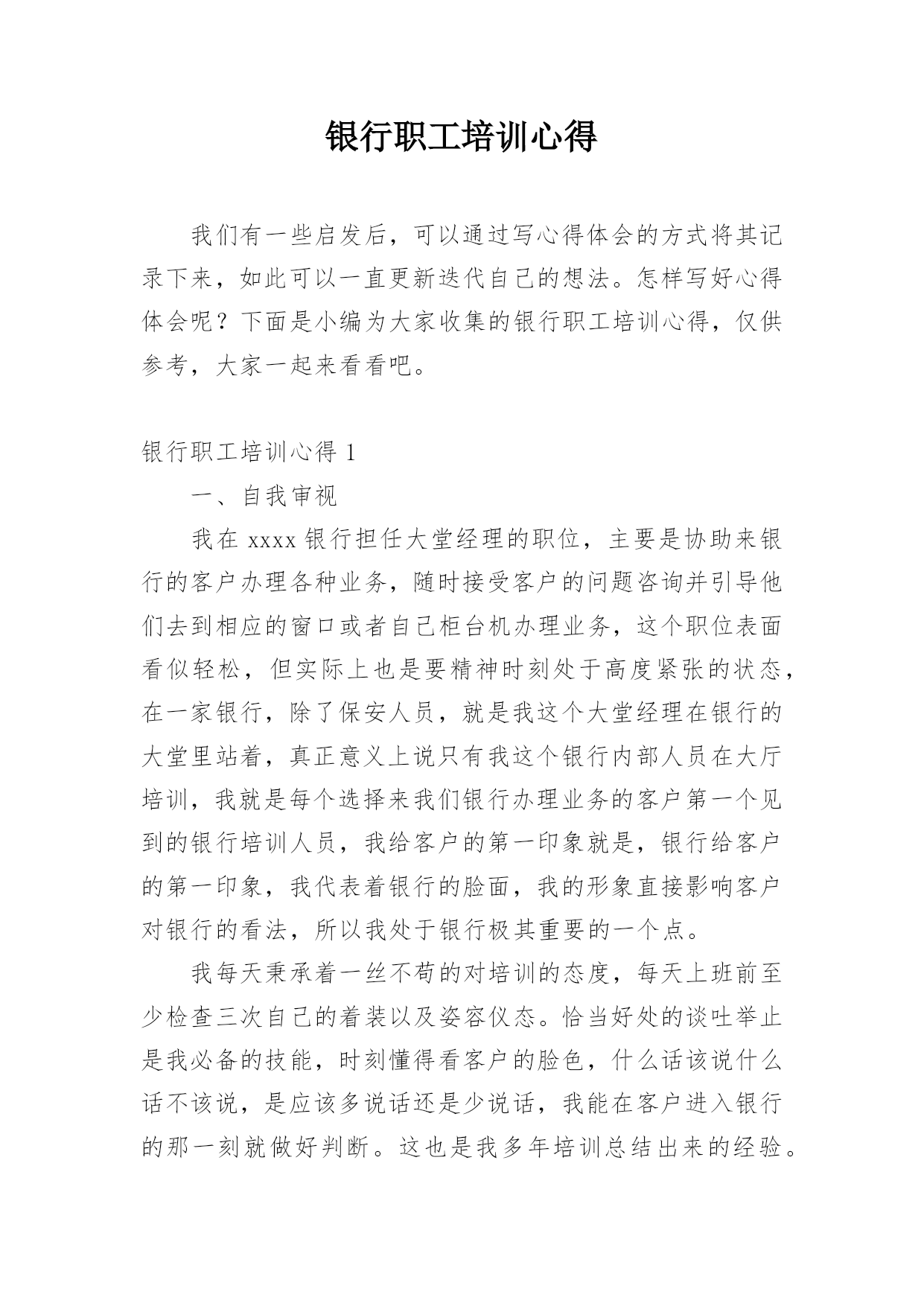 银行职工培训心得我们有一些启发后,可以通过写心得体会的方式将其记录下来,如此可以一直更新迭代自己的想法。怎样写好心得体会呢?下面是小编为大家收集的银行职工培训心得,仅供参考,大家一起来看看吧。银行职工培训心得1一、自我审视我在xxxx银行担任大堂经理的职位,主要是协助来银行的客户办理各种业务,随时接受客户的问题咨询并引导他们去到相应的窗口或者自己柜台机办理业务,这个职位表面看似轻松,但实际上也是要精神时刻处于高度紧张的状态,在一家银行,除了保安人员,就是我这个大堂经理在银行的大堂里站着,真正意义上说只有我