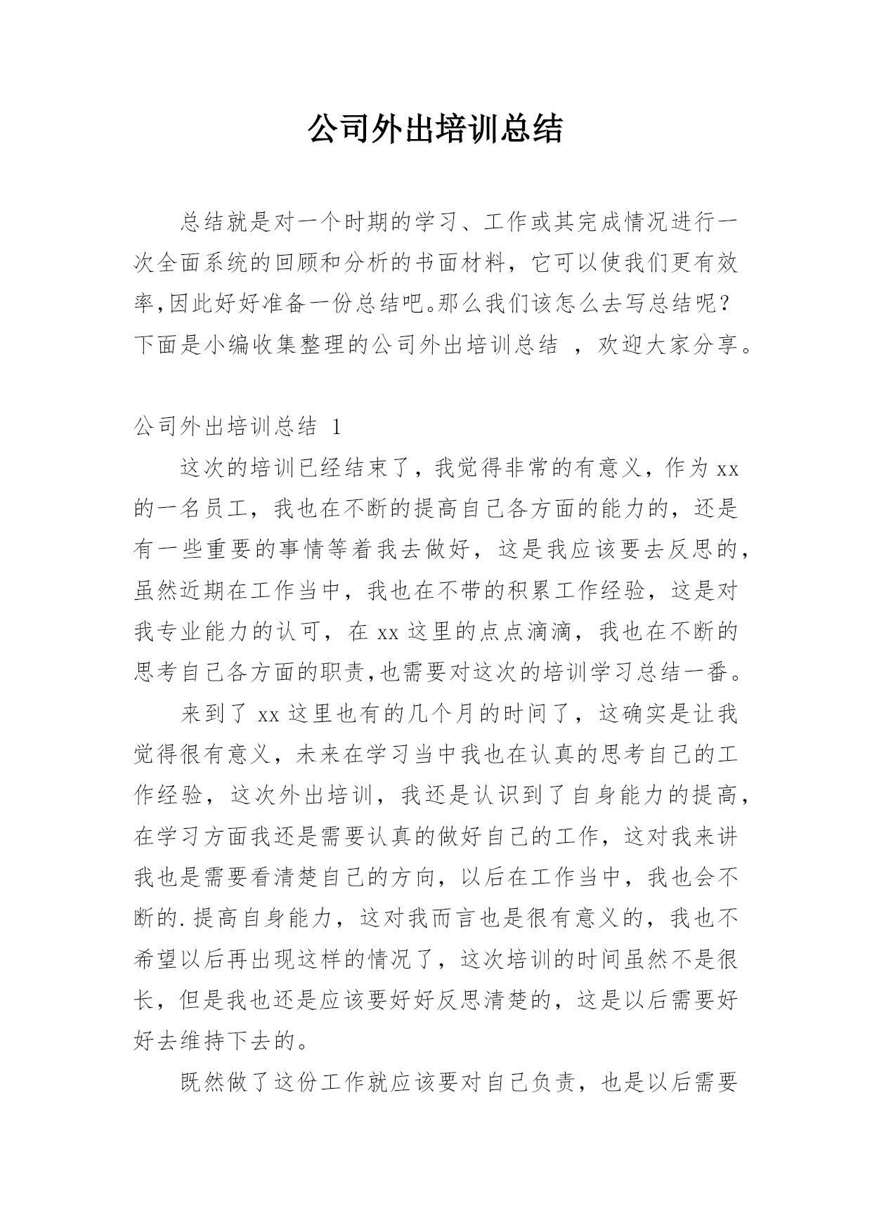 公司外出培训总结总结就是对一个时期的学习、工作或其完成情况进行一次全面系统的回顾和分析的书面材料,它可以使我们更有效率,因此好好准备一份总结吧。那么我们该怎么去写总结呢?下面是小编收集整理的公司外出培训总结,欢迎大家分享。公司外出培训总结1这次的培训已经结束了,我觉得非常的有意义,作为xx的一名员工,我也在不断的提高自己各方面的能力的,还是有一些重要的事情等着我去做好,这是我应该要去反思的,虽然近期在工作当中,我也在不带的积累工作经验,这是对我专业能力的认可,在xx这里的点点滴滴,我也在不断的思考自己各方