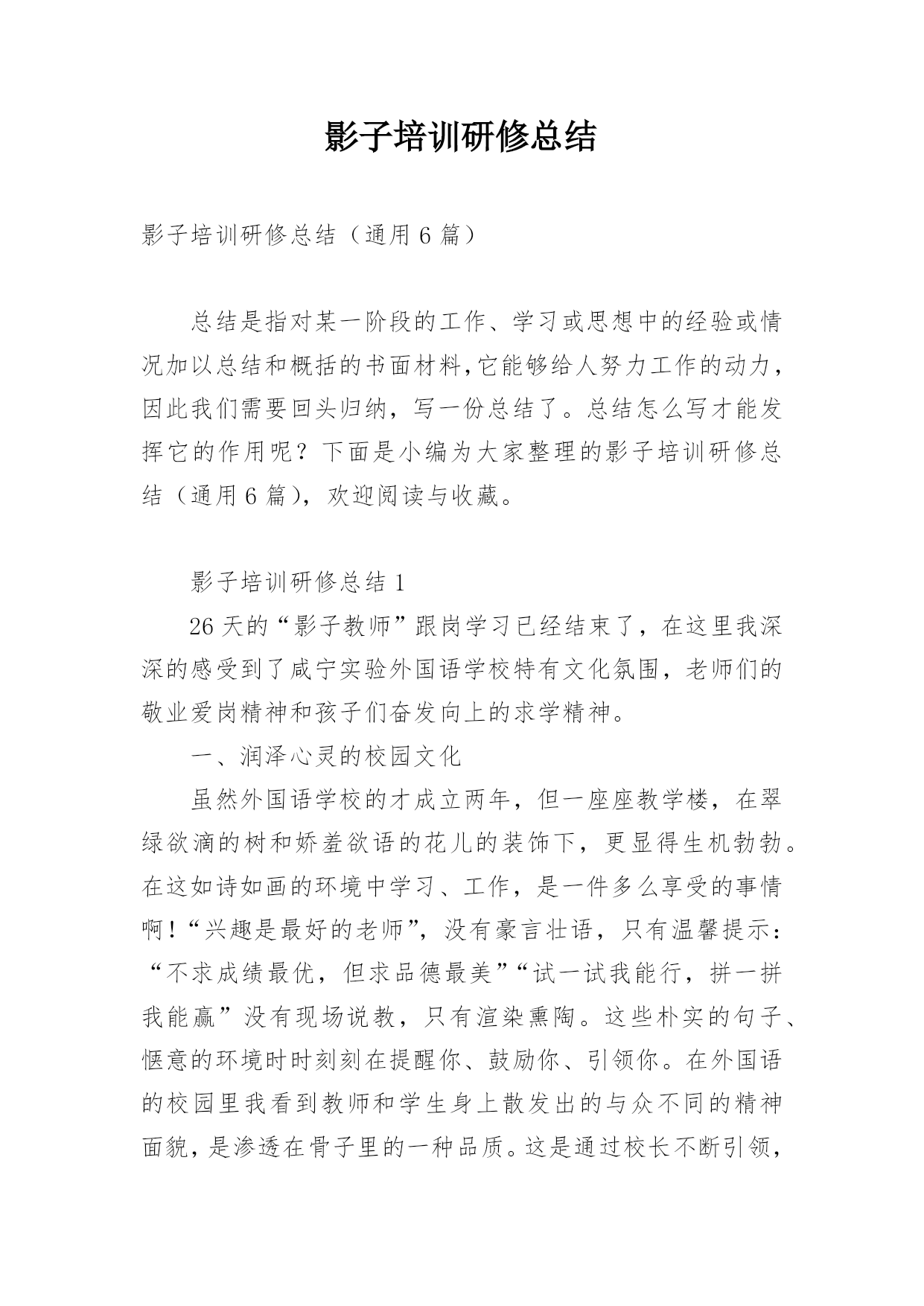 影子培训研修总结影子培训研修总结(通用6篇)总结是指对某一阶段的工作、学习或思想中的经验或情况加以总结和概括的书面材料,它能够给人努力工作的动力,因此我们需要回头归纳,写一份总结了。总结怎么写才能发挥它的作用呢?下面是小编为大家整理的影子培训研修总结(通用6篇),欢迎阅读与收藏。影子培训研修总结126天的“影子教师”跟岗学习已经结束了,在这里我深深的感受到了咸宁实验外国语学校特有文化氛围,老师们的敬业爱岗精神和孩子们奋发向上的求学精神。一、润泽心灵的校园文化虽然外国语学校的才成立两年,但一座座教学楼,在翠