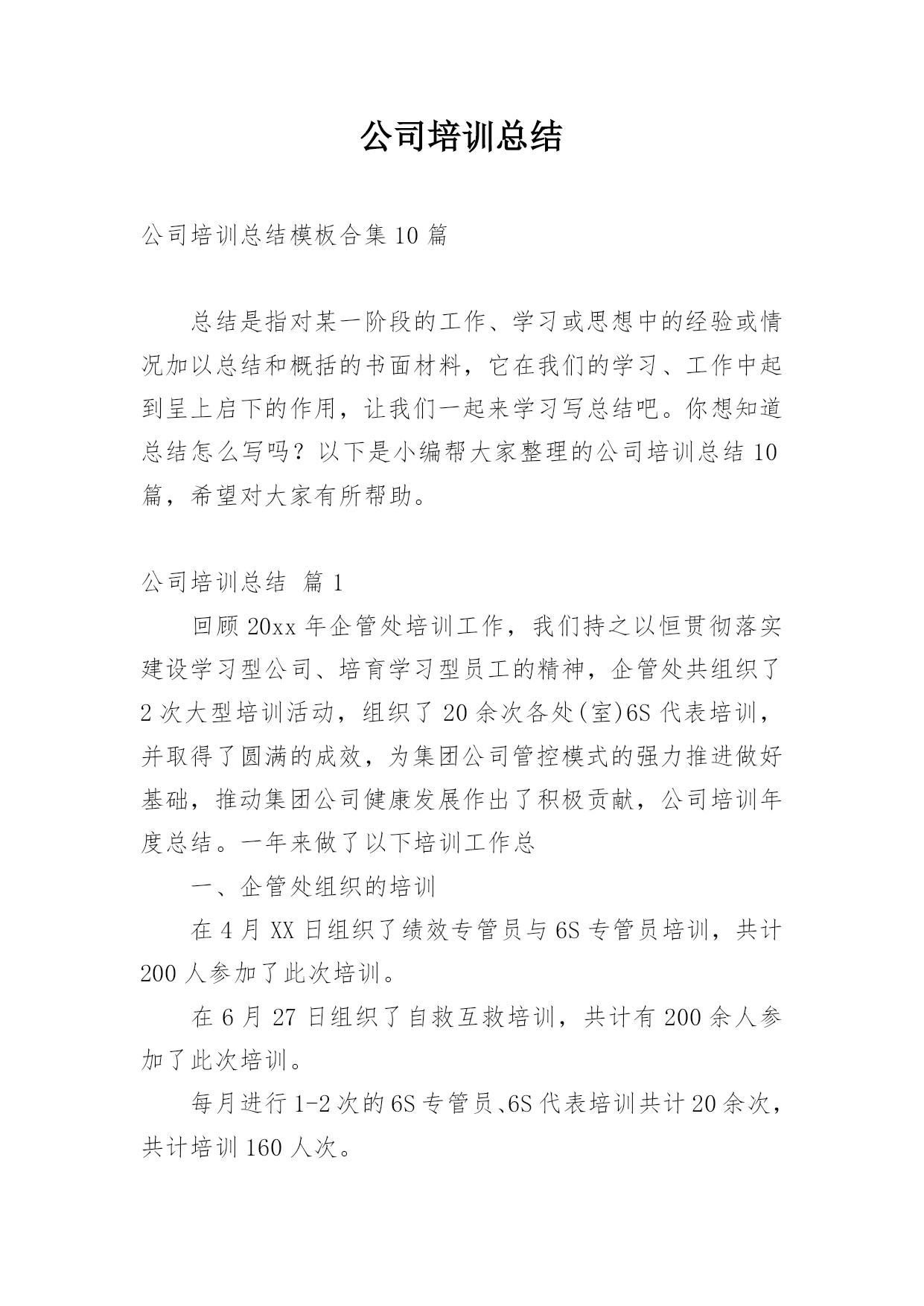 公司培训总结公司培训总结模板合集10篇总结是指对某一阶段的工作、学习或思想中的经验或情况加以总结和概括的书面材料,它在我们的学习、工作中起到呈上启下的作用,让我们一起来学习写总结吧。你想知道总结怎么写吗?以下是小编帮大家整理的公司培训总结10篇,希望对大家有所帮助。公司培训总结篇1回顾20xx年企管处培训工作,我们持之以恒贯彻落实建设学习型公司、培育学习型员工的精神,企管处共组织了2次大型培训活动,组织了20余次各处(室)6S代表培训,并取得了圆满的成效,为集团公司管控模式的强力推进做好基础,推动集团公司