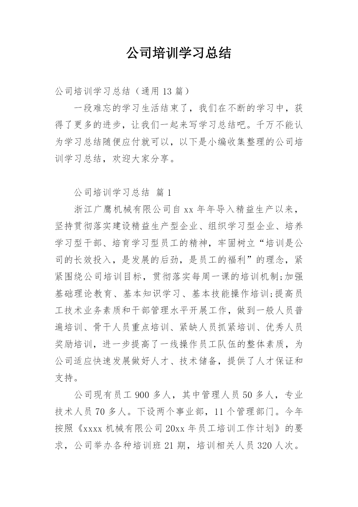 公司培训学习总结公司培训学习总结(通用13篇)一段难忘的学习生活结束了,我们在不断的学习中,获得了更多的进步,让我们一起来写学习总结吧。千万不能认为学习总结随便应付就可以,以下是小编收集整理的公司培训学习总结,欢迎大家分享。公司培训学习总结篇1浙江广鹰机械有限公司自xx年年导入精益生产以来,坚持贯彻落实建设精益生产型企业、组织学习型企业、培养学习型干部、培育学习型员工的精神,牢固树立“培训是公司的长效投入,是发展的后劲,是员工的福利”的理念,紧紧围绕公司培训目标,贯彻落实每周一课的培训机制;加强基础理论教
