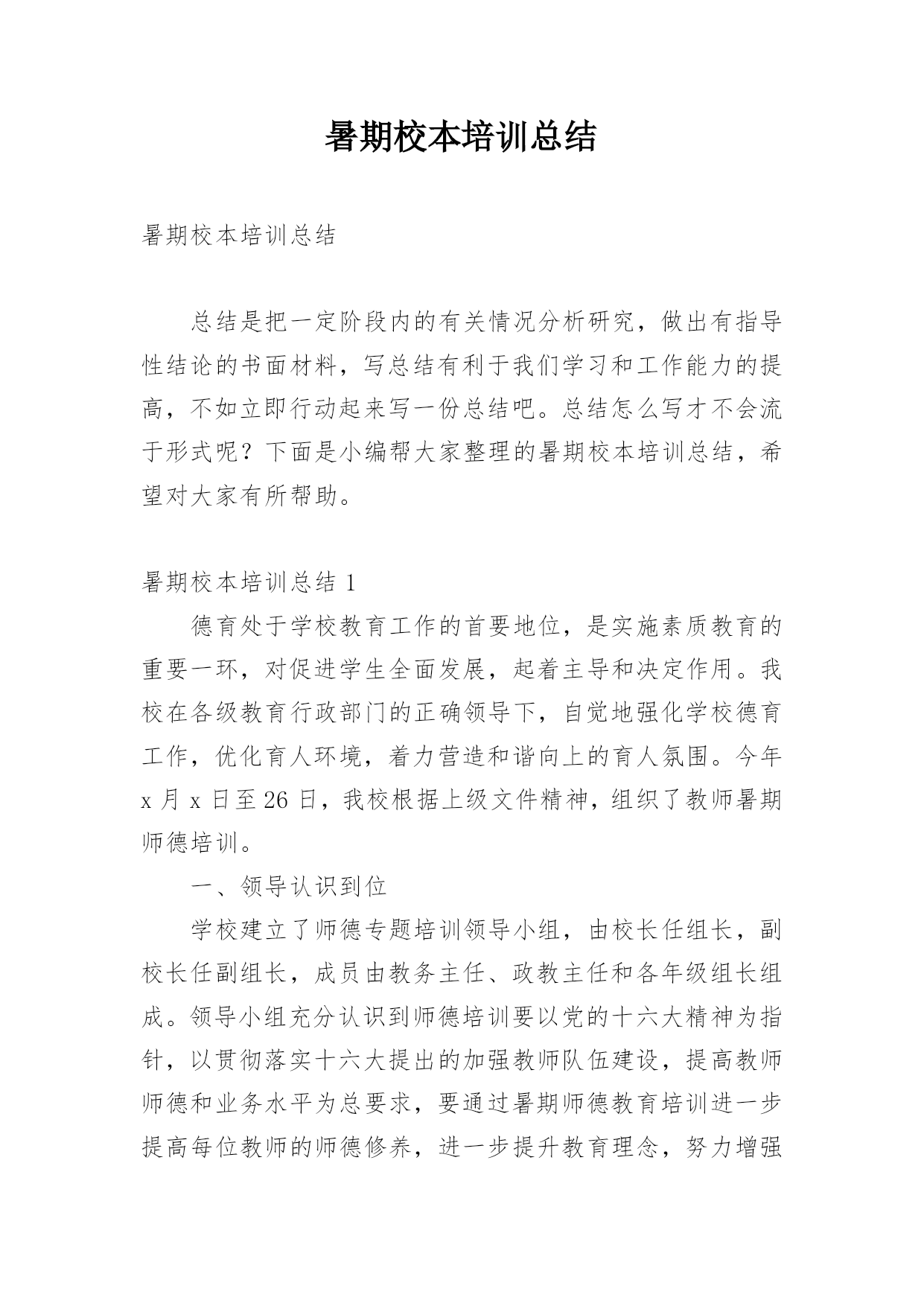 暑期校本培训总结暑期校本培训总结总结是把一定阶段内的有关情况分析研究,做出有指导性结论的书面材料,写总结有利于我们学习和工作能力的提高,不如立即行动起来写一份总结吧。总结怎么写才不会流于形式呢?下面是小编帮大家整理的暑期校本培训总结,希望对大家有所帮助。暑期校本培训总结1德育处于学校教育工作的首要地位,是实施素质教育的重要一环,对促进学生全面发展,起着主导和决定作用。我校在各级教育行政部门的正确领导下,自觉地强化学校德育工作,优化育人环境,着力营造和谐向上的育人氛围。今年x月x日至26日,我校根据上级文件