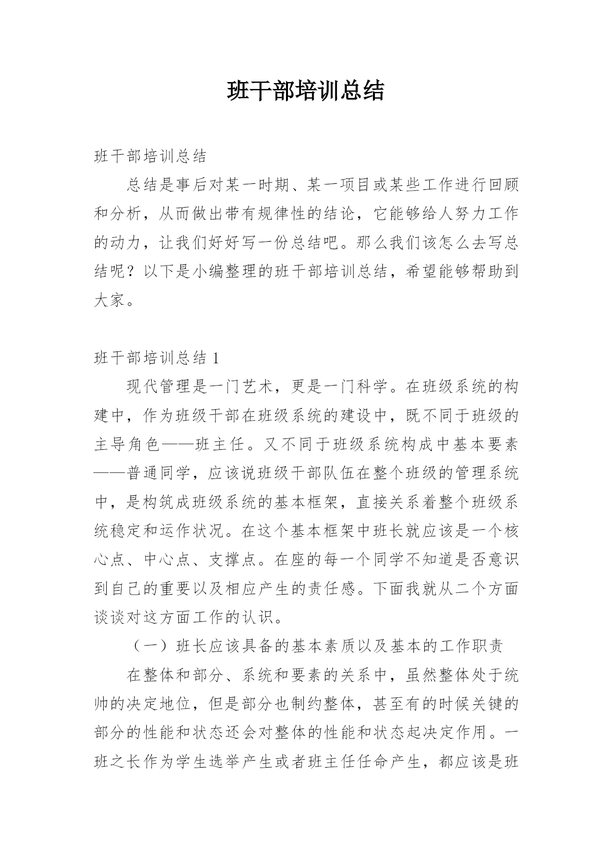 班干部培训总结班干部培训总结总结是事后对某一时期、某一项目或某些工作进行回顾和分析,从而做出带有规律性的结论,它能够给人努力工作的动力,让我们好好写一份总结吧。那么我们该怎么去写总结呢?以下是小编整理的班干部培训总结,希望能够帮助到大家。班干部培训总结1现代管理是一门艺术,更是一门科学。在班级系统的构建中,作为班级干部在班级系统的建设中,既不同于班级的主导角色——班主任。又不同于班级系统构成中基本要素——普通同学,应该说班级干部队伍在整个班级的管理系统中,是构筑成班级系统的基本框架,直接关系着整个班级系统