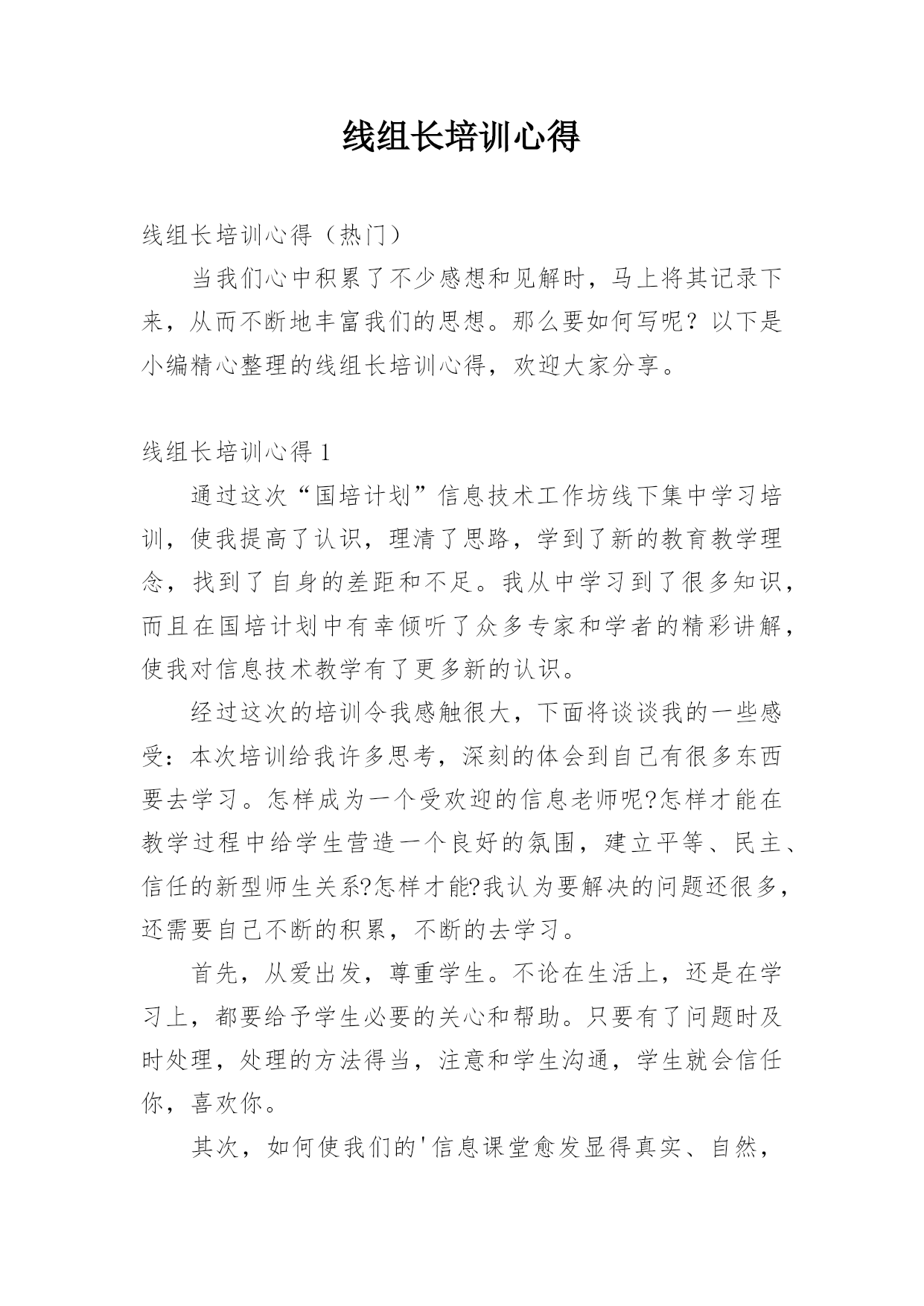 线组长培训心得线组长培训心得(热门)当我们心中积累了不少感想和见解时,马上将其记录下来,从而不断地丰富我们的思想。那么要如何写呢?以下是小编精心整理的线组长培训心得,欢迎大家分享。线组长培训心得1通过这次“国培计划”信息技术工作坊线下集中学习培训,使我提高了认识,理清了思路,学到了新的教育教学理念,找到了自身的差距和不足。我从中学习到了很多知识,而且在国培计划中有幸倾听了众多专家和学者的精彩讲解,使我对信息技术教学有了更多新的认识。经过这次的培训令我感触很大,下面将谈谈我的一些感受:本次培训给我许多思考,