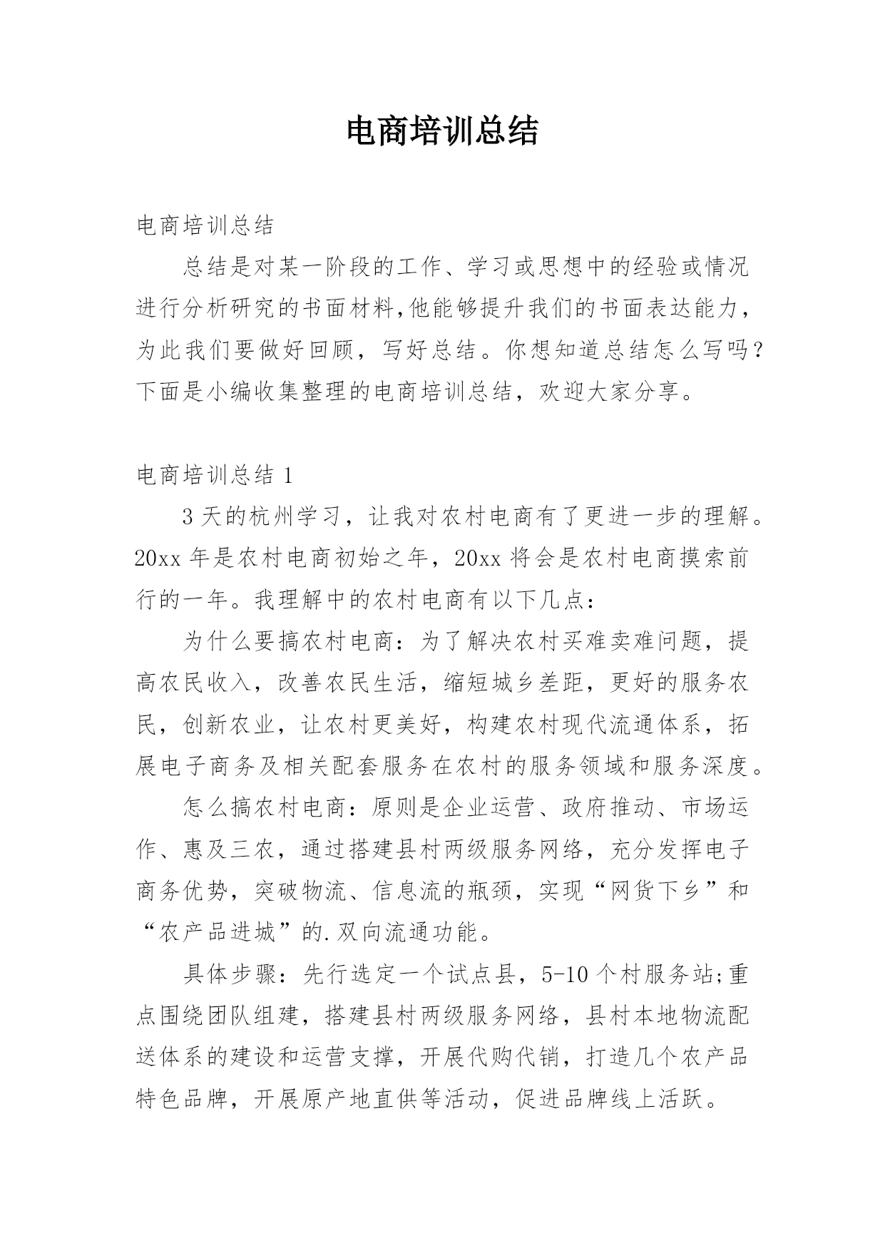 电商培训总结电商培训总结总结是对某一阶段的工作、学习或思想中的经验或情况进行分析研究的书面材料,他能够提升我们的书面表达能力,为此我们要做好回顾,写好总结。你想知道总结怎么写吗?下面是小编收集整理的电商培训总结,欢迎大家分享。电商培训总结13天的杭州学习,让我对农村电商有了更进一步的理解。20xx年是农村电商初始之年,20xx将会是农村电商摸索前行的一年。我理解中的农村电商有以下几点:为什么要搞农村电商:为了解决农村买难卖难问题,提高农民收入,改善农民生活,缩短城乡差距,更好的服务农民,创新农业,让农村更