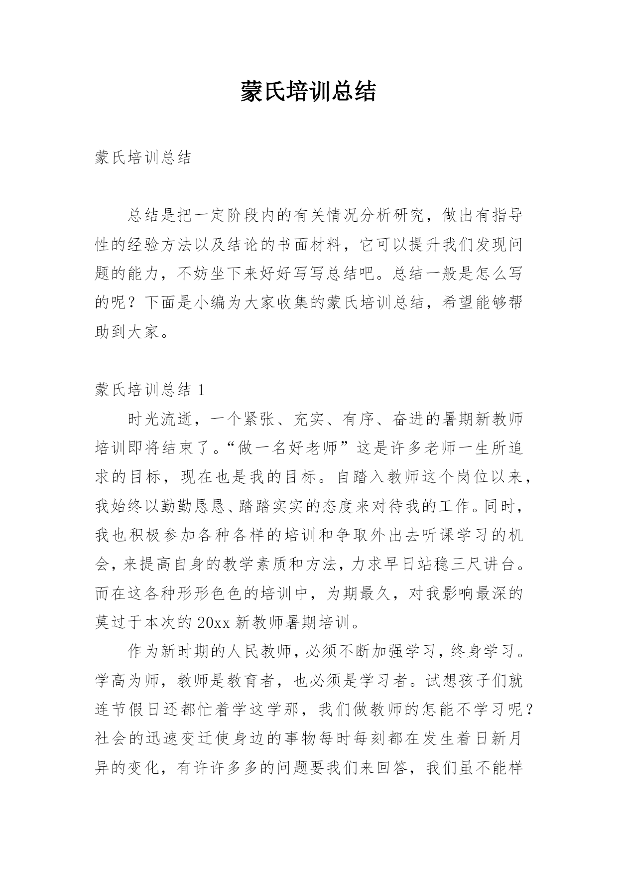 蒙氏培训总结蒙氏培训总结总结是把一定阶段内的有关情况分析研究,做出有指导性的经验方法以及结论的书面材料,它可以提升我们发现问题的能力,不妨坐下来好好写写总结吧。总结一般是怎么写的呢?下面是小编为大家收集的蒙氏培训总结,希望能够帮助到大家。蒙氏培训总结1时光流逝,一个紧张、充实、有序、奋进的暑期新教师培训即将结束了。“做一名好老师”这是许多老师一生所追求的目标,现在也是我的目标。自踏入教师这个岗位以来,我始终以勤勤恳恳、踏踏实实的态度来对待我的工作。同时,我也积极参加各种各样的培训和争取外出去听课学习的机会