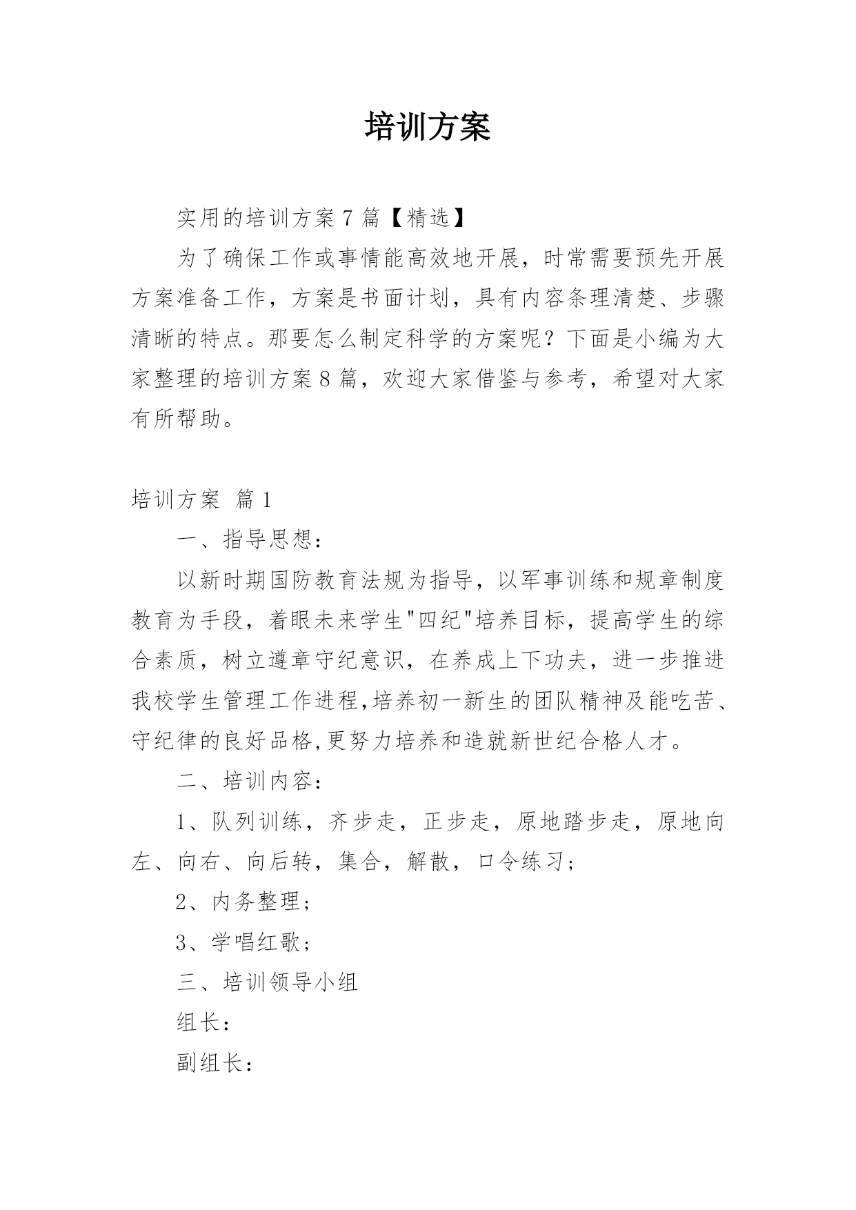 培训方案实用的培训方案7篇【精选】为了确保工作或事情能高效地开展,时常需要预先开展方案准备工作,方案是书面计划,具有内容条理清楚、步骤清晰的特点。那要怎么制定科学的方案呢?下面是小编为大家整理的培训方案8篇,欢迎大家借鉴与参考,希望对大家有所帮助。培训方案篇1一、指导思想:以新时期国防教育法规为指导,以军事训练和规章制度教育为手段,着眼未来学生"四纪"培养目标,提高学生的综合素质,树立遵章守纪意识,在养成上下功夫,进一步推进我校学生管理工作进程,培养初一新生的团队精神及能吃苦、守纪律的良好品格,更努力培养