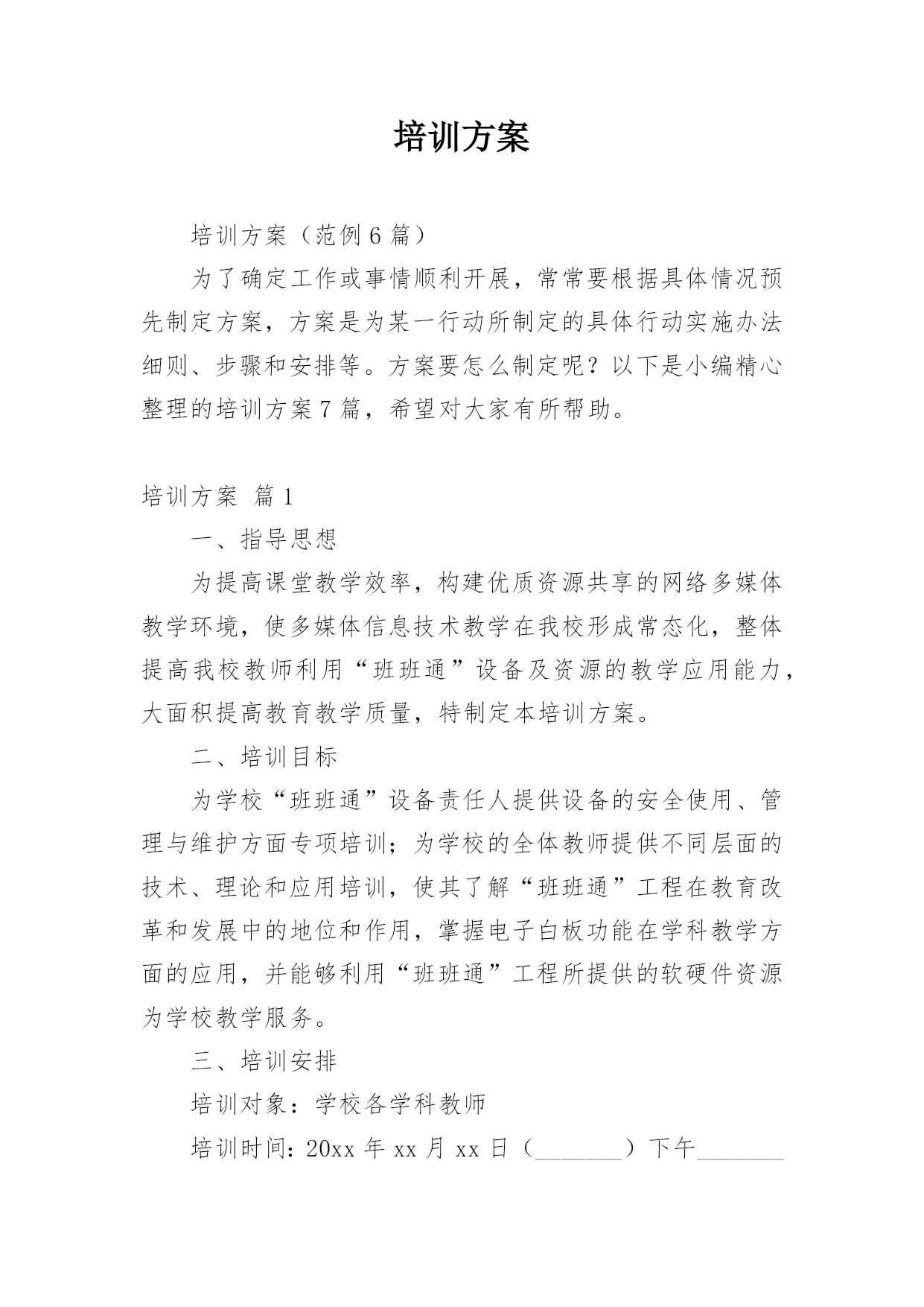培训方案培训方案(范例6篇)为了确定工作或事情顺利开展,常常要根据具体情况预先制定方案,方案是为某一行动所制定的具体行动实施办法细则、步骤和安排等。方案要怎么制定呢?以下是小编精心整理的培训方案7篇,希望对大家有所帮助。培训方案篇1一、指导思想为提高课堂教学效率,构建优质资源共享的网络多媒体教学环境,使多媒体信息技术教学在我校形成常态化,整体提高我校教师利用“班班通”设备及资源的教学应用能力,大面积提高教育教学质量,特制定本培训方案。二、培训目标为学校“班班通”设备责任人提供设备的安全使用、管理与维护方面