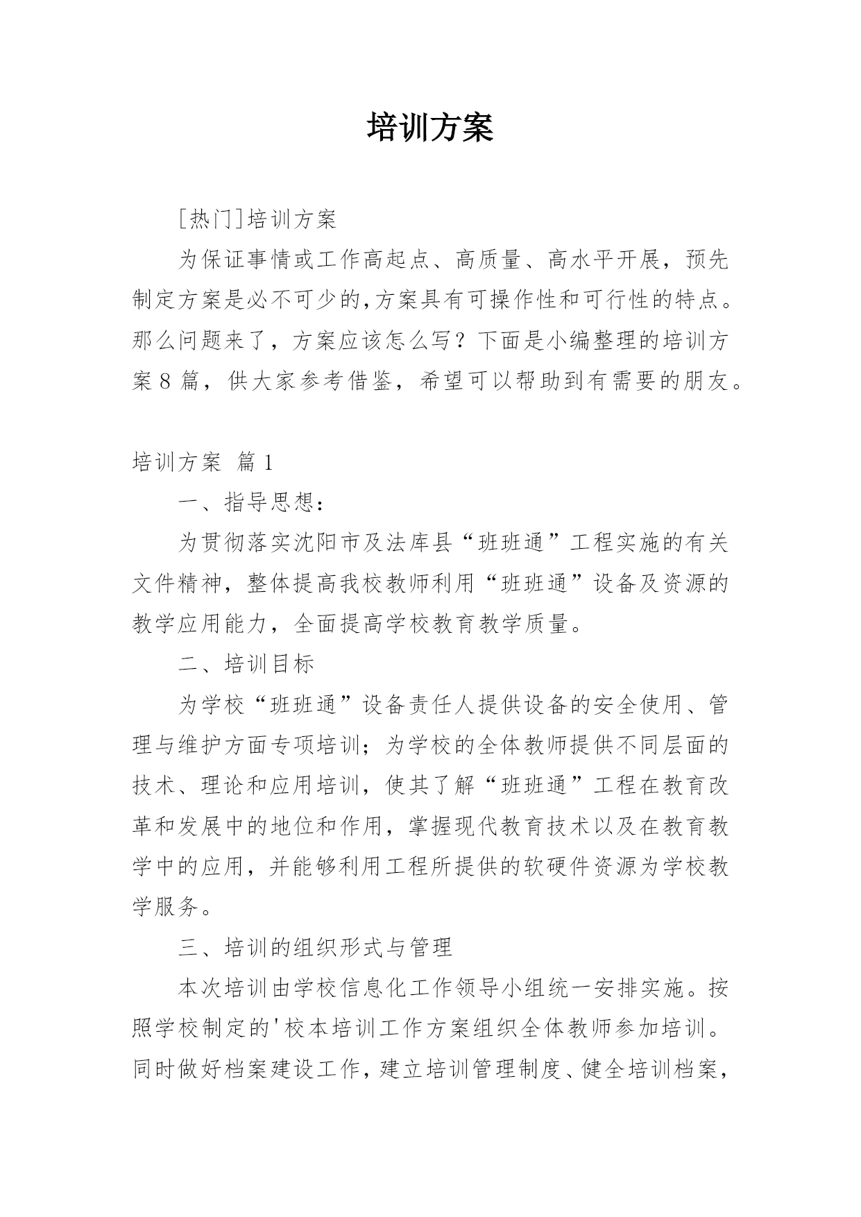 培训方案[热门]培训方案为保证事情或工作高起点、高质量、高水平开展,预先制定方案是必不可少的,方案具有可操作性和可行性的特点。那么问题来了,方案应该怎么写?下面是小编整理的培训方案8篇,供大家参考借鉴,希望可以帮助到有需要的朋友。培训方案篇1一、指导思想:为贯彻落实沈阳市及法库县“班班通”工程实施的有关文件精神,整体提高我校教师利用“班班通”设备及资源的教学应用能力,全面提高学校教育教学质量。二、培训目标为学校“班班通”设备责任人提供设备的安全使用、管理与维护方面专项培训;为学校的全体教师提供不同层面的技