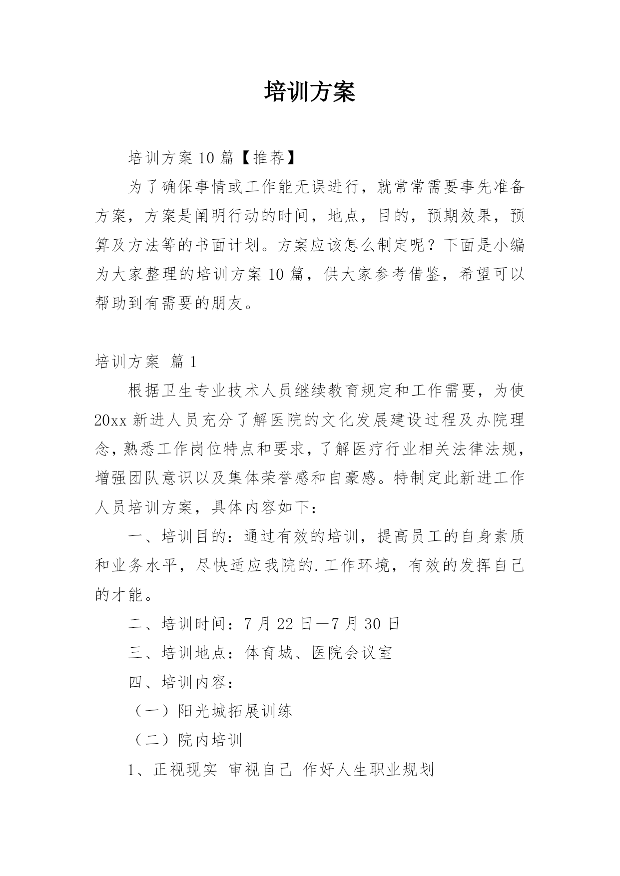 培训方案培训方案10篇【推荐】为了确保事情或工作能无误进行,就常常需要事先准备方案,方案是阐明行动的时间,地点,目的,预期效果,预算及方法等的书面计划。方案应该怎么制定呢?下面是小编为大家整理的培训方案10篇,供大家参考借鉴,希望可以帮助到有需要的朋友。培训方案篇1根据卫生专业技术人员继续教育规定和工作需要,为使20xx新进人员充分了解医院的文化发展建设过程及办院理念,熟悉工作岗位特点和要求,了解医疗行业相关法律法规,增强团队意识以及集体荣誉感和自豪感。特制定此新进工作人员培训方案,具体内容如下:一、培训
