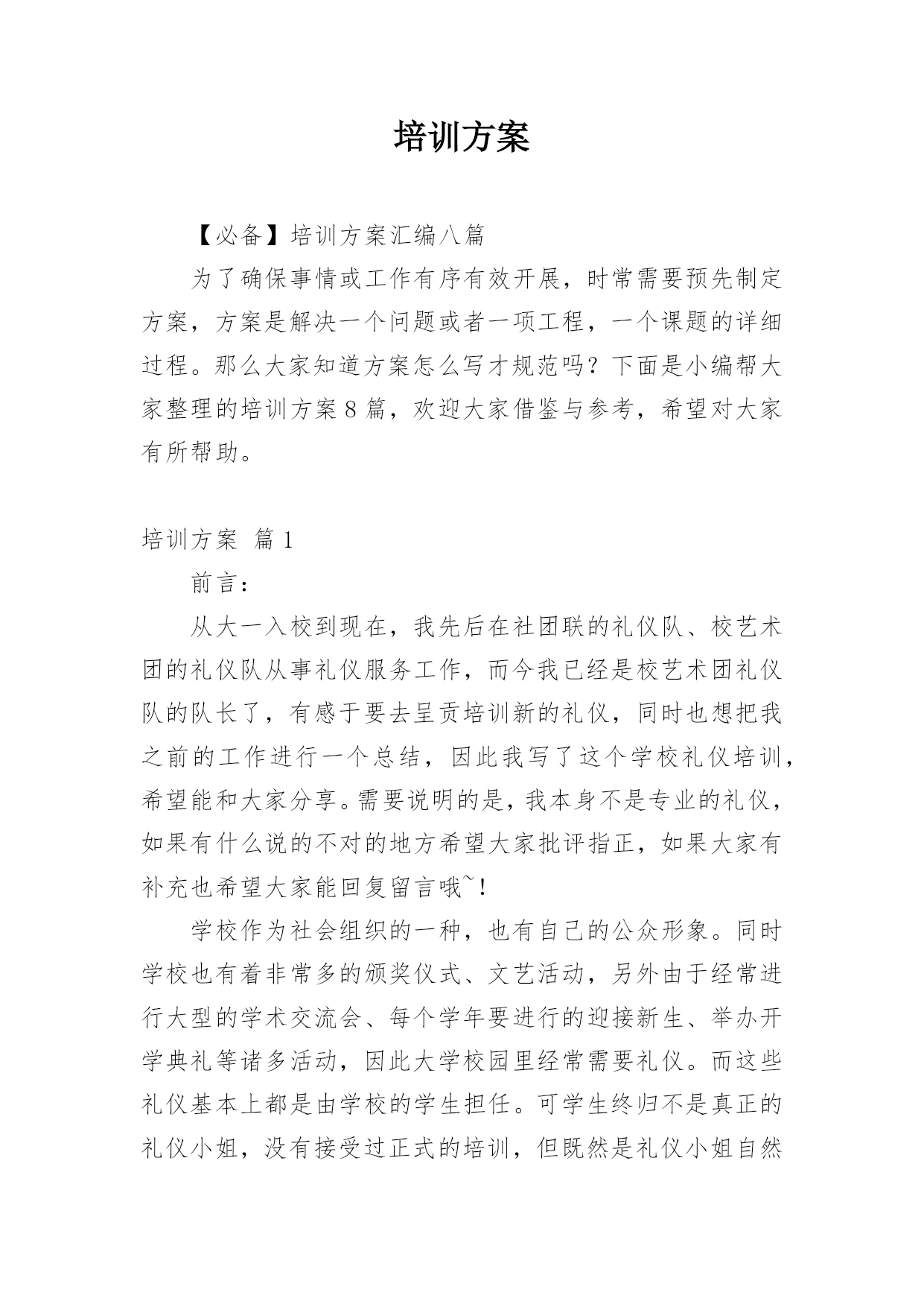 培训方案【必备】培训方案汇编八篇为了确保事情或工作有序有效开展,时常需要预先制定方案,方案是解决一个问题或者一项工程,一个课题的详细过程。那么大家知道方案怎么写才规范吗?下面是小编帮大家整理的培训方案8篇,欢迎大家借鉴与参考,希望对大家有所帮助。培训方案篇1前言:从大一入校到现在,我先后在社团联的礼仪队、校艺术团的礼仪队从事礼仪服务工作,而今我已经是校艺术团礼仪队的队长了,有感于要去呈贡培训新的礼仪,同时也想把我之前的工作进行一个总结,因此我写了这个学校礼仪培训,希望能和大家分享。需要说明的是,我本身不是
