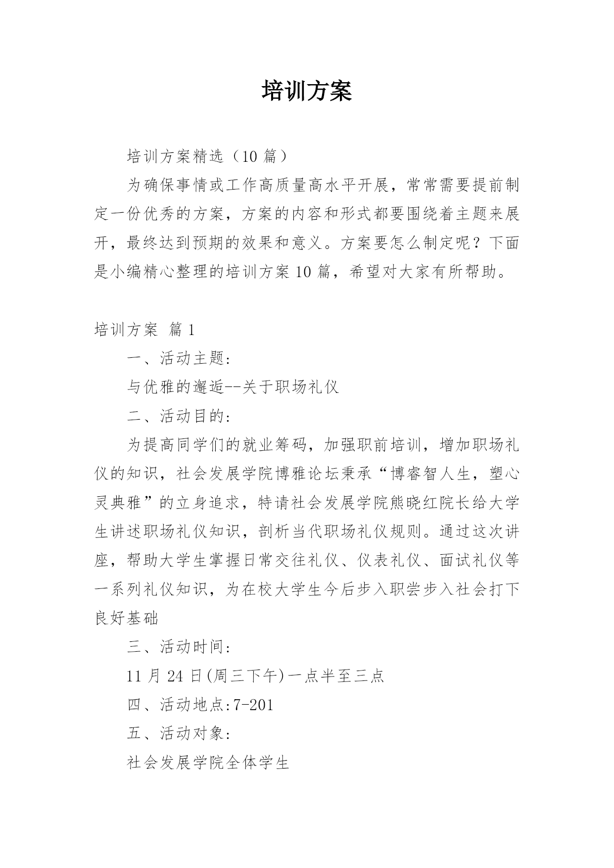 培训方案培训方案精选(10篇)为确保事情或工作高质量高水平开展,常常需要提前制定一份优秀的方案,方案的内容和形式都要围绕着主题来展开,最终达到预期的效果和意义。方案要怎么制定呢?下面是小编精心整理的培训方案10篇,希望对大家有所帮助。培训方案篇1一、活动主题:与优雅的邂逅--关于职场礼仪二、活动目的:为提高同学们的就业筹码,加强职前培训,增加职场礼仪的知识,社会发展学院博雅论坛秉承“博睿智人生,塑心灵典雅”的立身追求,特请社会发展学院熊晓红院长给大学生讲述职场礼仪知识,剖析当代职场礼仪规则。通过这次讲座,
