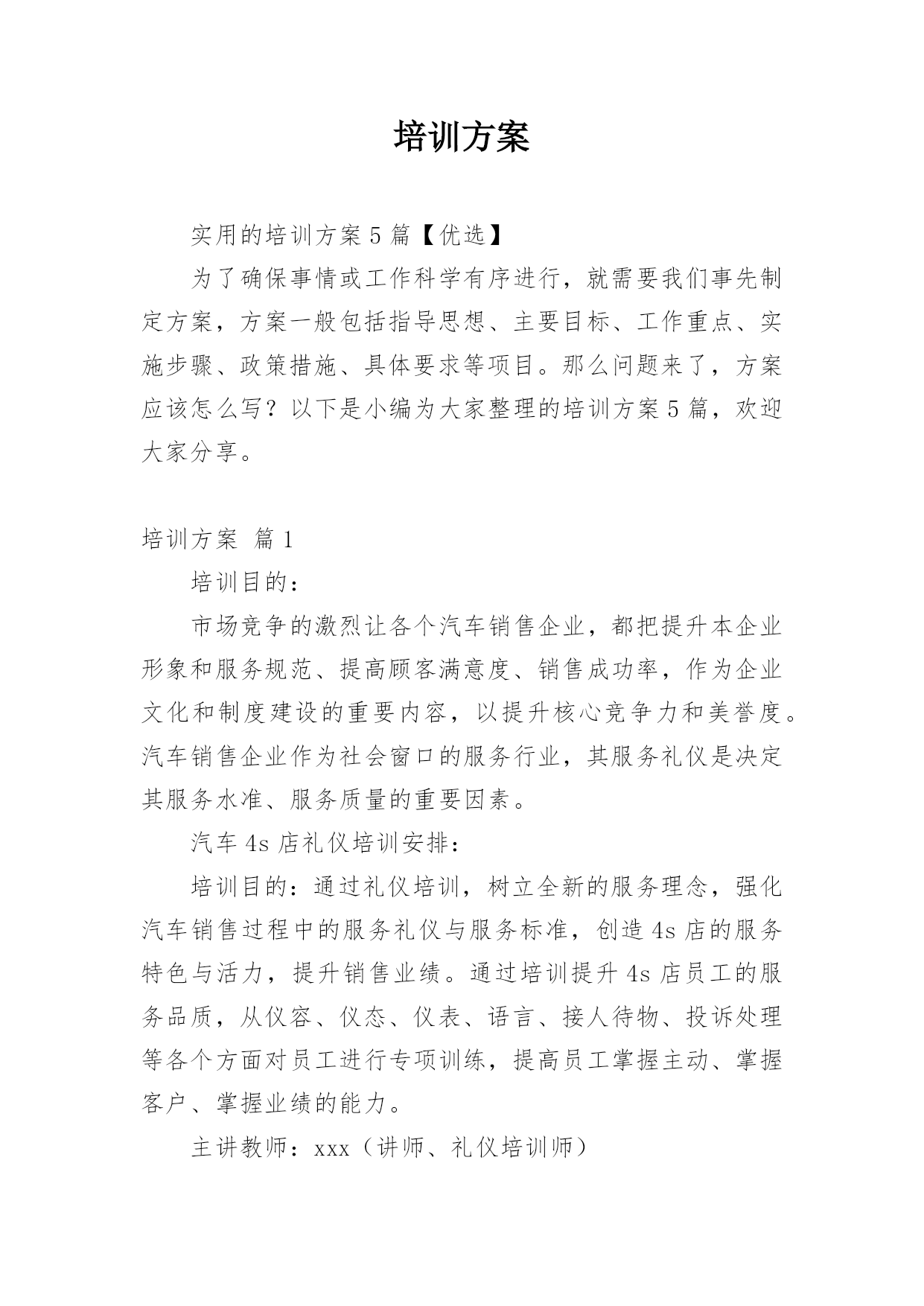 培训方案实用的培训方案5篇【优选】为了确保事情或工作科学有序进行,就需要我们事先制定方案,方案一般包括指导思想、主要目标、工作重点、实施步骤、政策措施、具体要求等项目。那么问题来了,方案应该怎么写?以下是小编为大家整理的培训方案5篇,欢迎大家分享。培训方案篇1培训目的:市场竞争的激烈让各个汽车销售企业,都把提升本企业形象和服务规范、提高顾客满意度、销售成功率,作为企业文化和制度建设的重要内容,以提升核心竞争力和美誉度。汽车销售企业作为社会窗口的服务行业,其服务礼仪是决定其服务水准、服务质量的重要因素。汽车