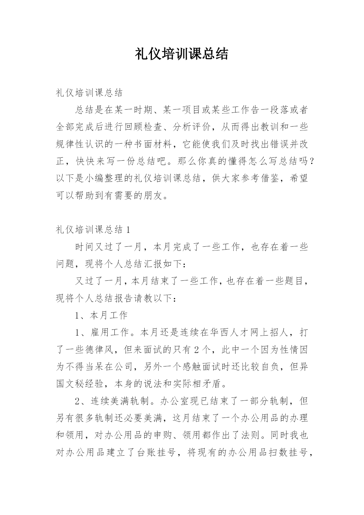 礼仪培训课总结礼仪培训课总结总结是在某一时期、某一项目或某些工作告一段落或者全部完成后进行回顾检查、分析评价,从而得出教训和一些规律性认识的一种书面材料,它能使我们及时找出错误并改正,快快来写一份总结吧。那么你真的懂得怎么写总结吗?以下是小编整理的礼仪培训课总结,供大家参考借鉴,希望可以帮助到有需要的朋友。礼仪培训课总结1时间又过了一月,本月完成了一些工作,也存在着一些问题,现将个人总结汇报如下:又过了一月,本月结束了一些工作,也存在着一些题目,现将个人总结报告请教以下:1、本月工作1、雇用工作。本月还是
