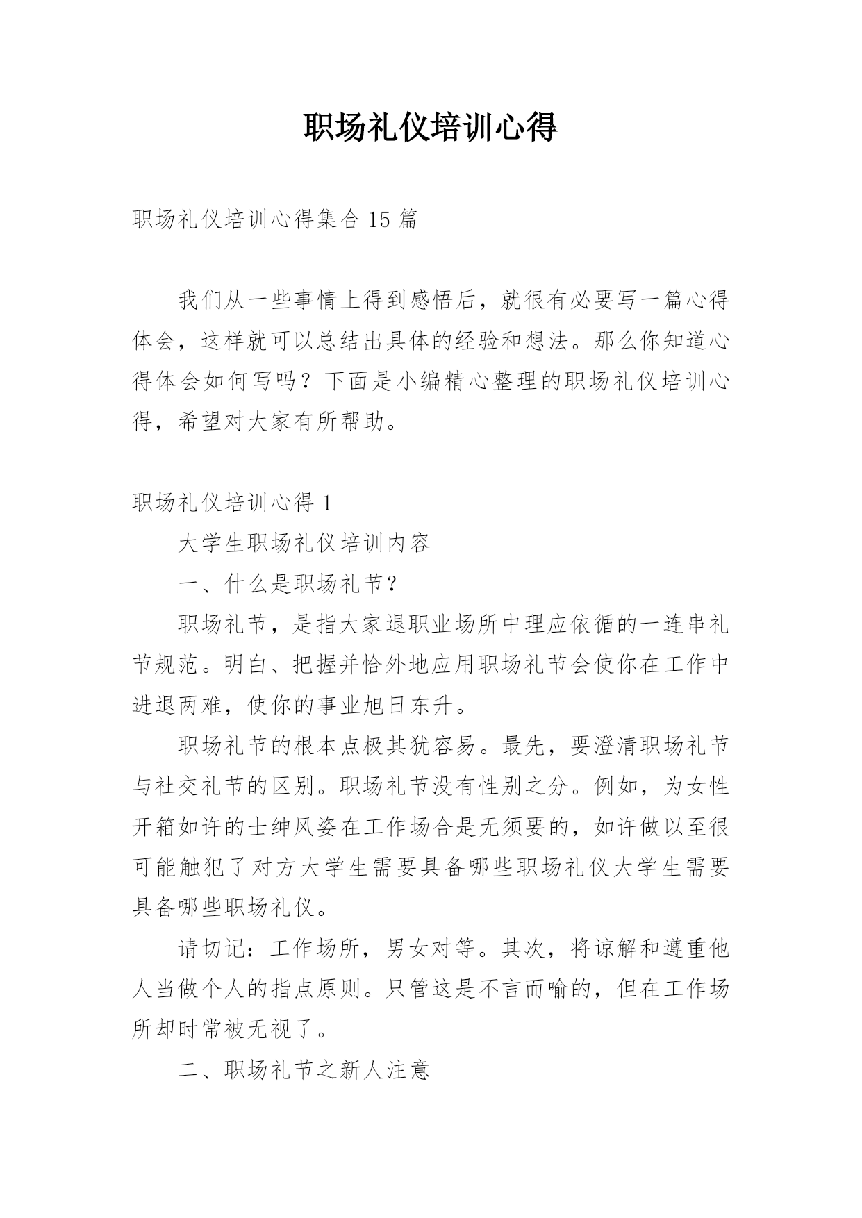 职场礼仪培训心得职场礼仪培训心得集合15篇我们从一些事情上得到感悟后,就很有必要写一篇心得体会,这样就可以总结出具体的经验和想法。那么你知道心得体会如何写吗?下面是小编精心整理的职场礼仪培训心得,希望对大家有所帮助。职场礼仪培训心得1大学生职场礼仪培训内容一、什么是职场礼节?职场礼节,是指大家退职业场所中理应依循的一连串礼节规范。明白、把握并恰外地应用职场礼节会使你在工作中进退两难,使你的事业旭日东升。职场礼节的根本点极其犹容易。最先,要澄清职场礼节与社交礼节的区别。职场礼节没有性别之分。例如,为女性开箱