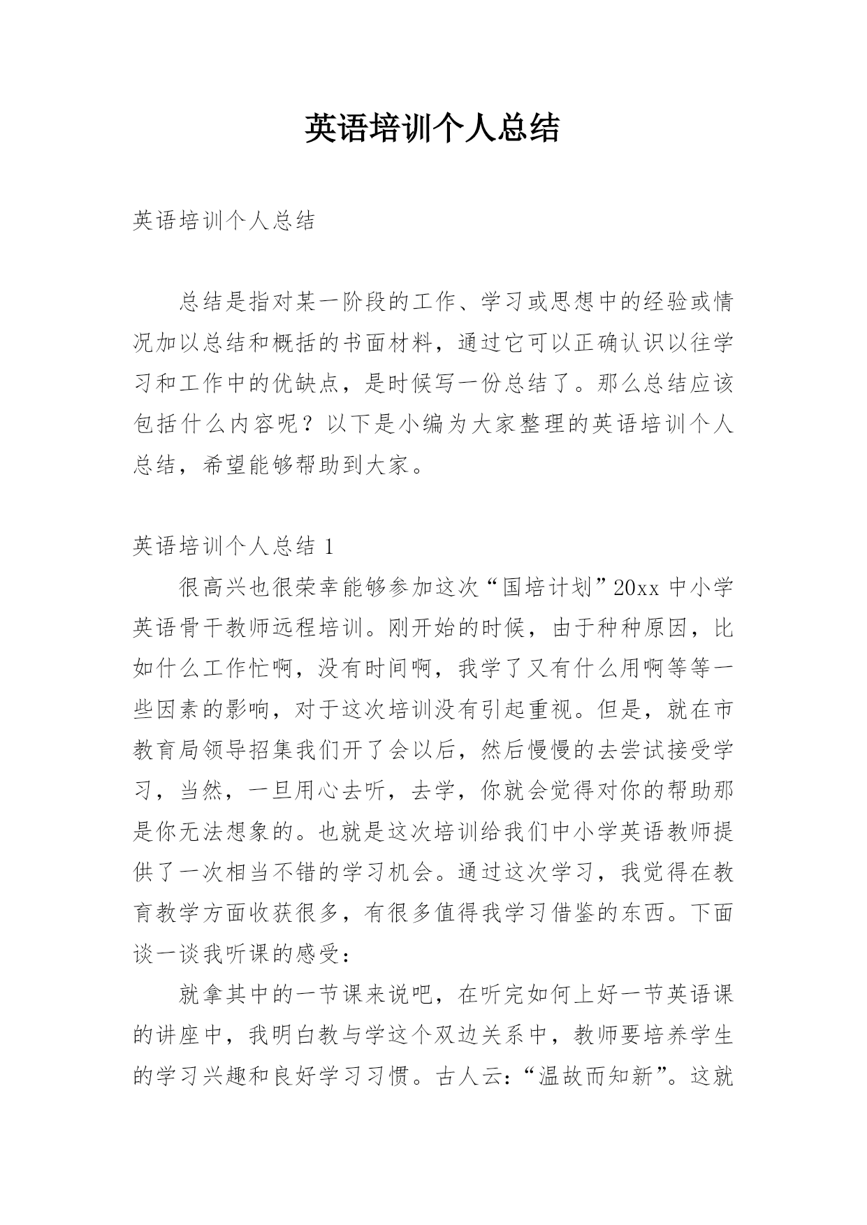 英语培训个人总结英语培训个人总结总结是指对某一阶段的工作、学习或思想中的经验或情况加以总结和概括的书面材料,通过它可以正确认识以往学习和工作中的优缺点,是时候写一份总结了。那么总结应该包括什么内容呢?以下是小编为大家整理的英语培训个人总结,希望能够帮助到大家。英语培训个人总结1很高兴也很荣幸能够参加这次“国培计划”20xx中小学英语骨干教师远程培训。刚开始的时候,由于种种原因,比如什么工作忙啊,没有时间啊,我学了又有什么用啊等等一些因素的影响,对于这次培训没有引起重视。但是,就在市教育局领导招集我们开了会