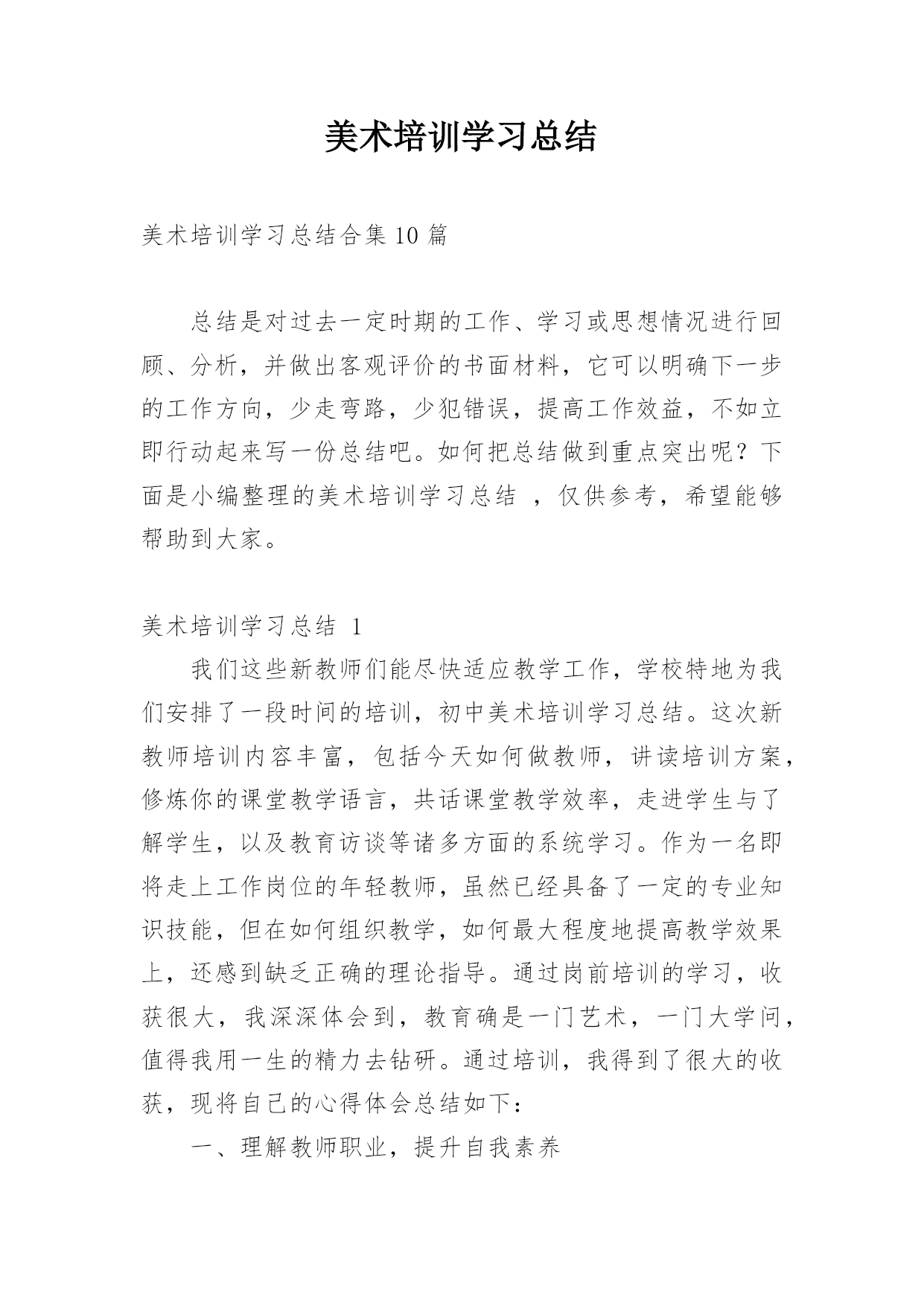 美术培训学习总结美术培训学习总结合集10篇总结是对过去一定时期的工作、学习或思想情况进行回顾、分析,并做出客观评价的书面材料,它可以明确下一步的工作方向,少走弯路,少犯错误,提高工作效益,不如立即行动起来写一份总结吧。如何把总结做到重点突出呢?下面是小编整理的美术培训学习总结,仅供参考,希望能够帮助到大家。美术培训学习总结1我们这些新教师们能尽快适应教学工作,学校特地为我们安排了一段时间的培训,初中美术培训学习总结。这次新教师培训内容丰富,包括今天如何做教师,讲读培训方案,修炼你的课堂教学语言,共话课堂教