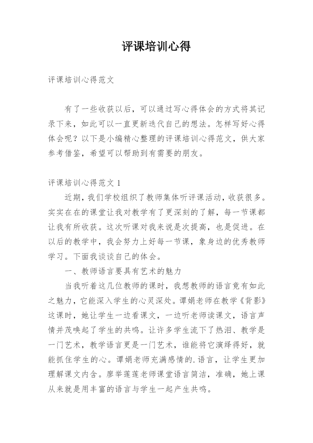 评课培训心得评课培训心得范文有了一些收获以后,可以通过写心得体会的方式将其记录下来,如此可以一直更新迭代自己的想法。怎样写好心得体会呢?以下是小编精心整理的评课培训心得范文,供大家参考借鉴,希望可以帮助到有需要的朋友。评课培训心得范文1近期,我们学校组织了教师集体听评课活动,收获很多。实实在在的课堂让我对教学有了更深刻的了解,每一节课都让我有所收获。这次听课对我来说是次提高,也是促进。在以后的教学中,我会努力上好每一节课,象身边的优秀教师学习。下面我谈谈自己的体会。一、教师语言要具有艺术的魅力当我听着这几