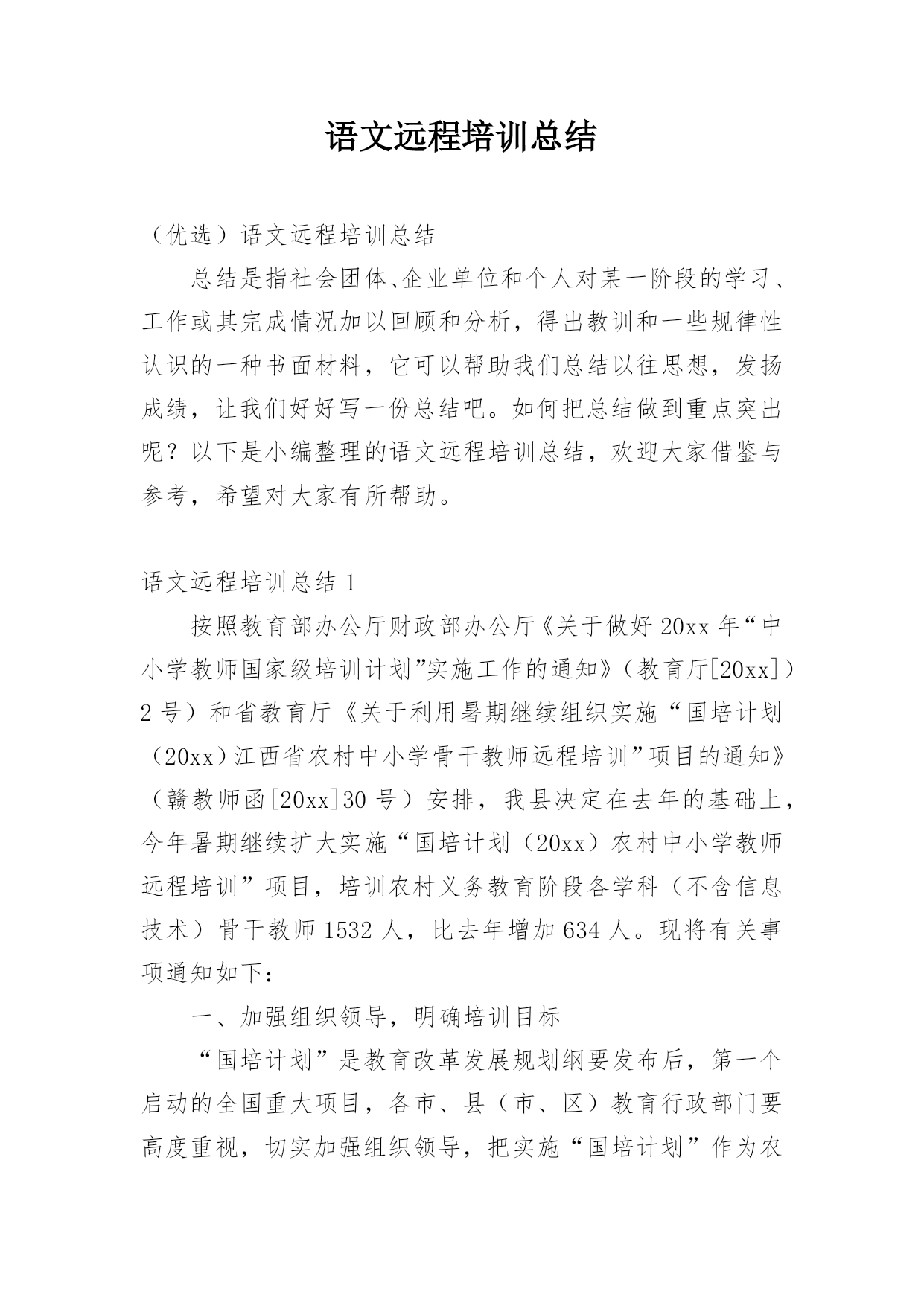 语文远程培训总结(优选)语文远程培训总结总结是指社会团体、企业单位和个人对某一阶段的学习、工作或其完成情况加以回顾和分析,得出教训和一些规律性认识的一种书面材料,它可以帮助我们总结以往思想,发扬成绩,让我们好好写一份总结吧。如何把总结做到重点突出呢?以下是小编整理的语文远程培训总结,欢迎大家借鉴与参考,希望对大家有所帮助。语文远程培训总结1按照教育部办公厅财政部办公厅《关于做好20xx年“中小学教师国家级培训计划”实施工作的通知》(教育厅[20xx])2号)和省教育厅《关于利用暑期继续组织实施“国培计划(