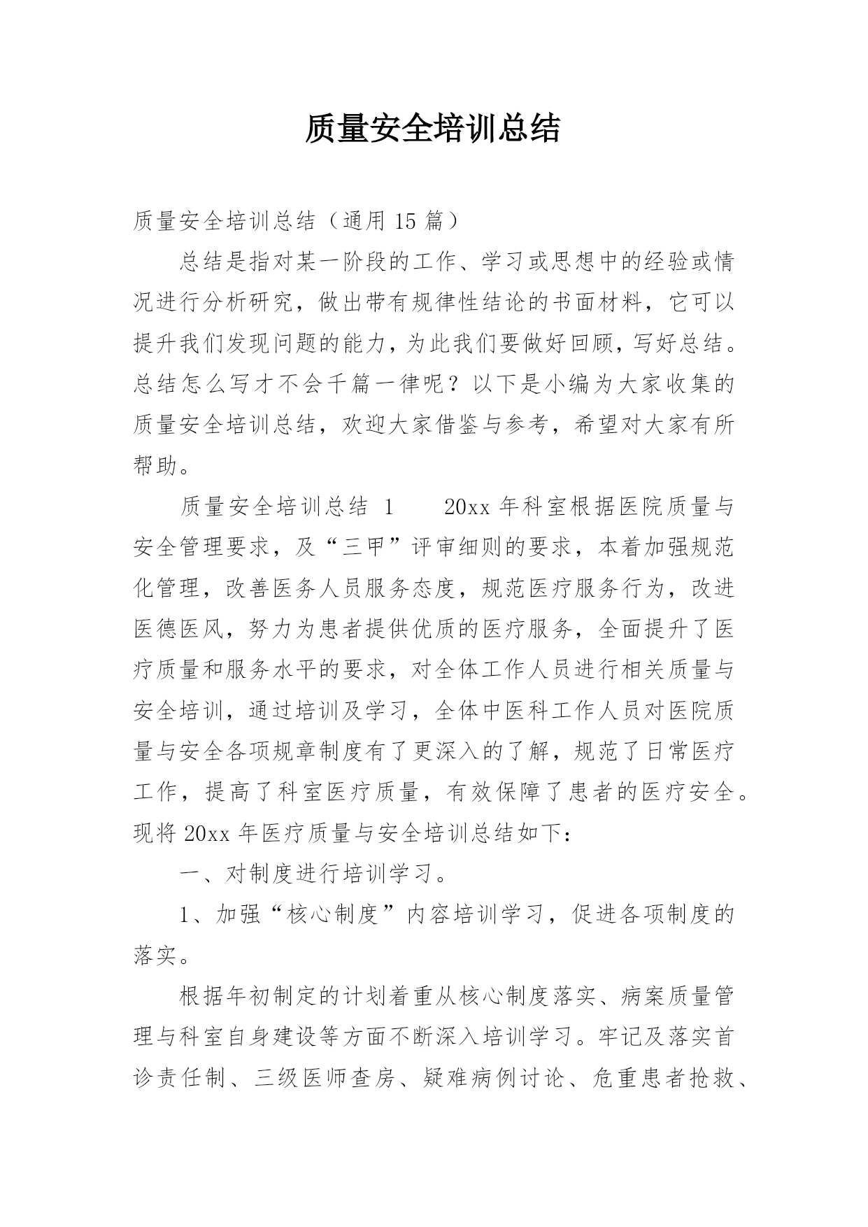 质量安全培训总结质量安全培训总结(通用15篇)总结是指对某一阶段的工作、学习或思想中的经验或情况进行分析研究,做出带有规律性结论的书面材料,它可以提升我们发现问题的能力,为此我们要做好回顾,写好总结。总结怎么写才不会千篇一律呢?以下是小编为大家收集的质量安全培训总结,欢迎大家借鉴与参考,希望对大家有所帮助。质量安全培训总结120xx年科室根据医院质量与安全管理要求,及“三甲”评审细则的要求,本着加强规范化管理,改善医务人员服务态度,规范医疗服务行为,改进医德医风,努力为患者提供优质的医疗服务,全面提升了医