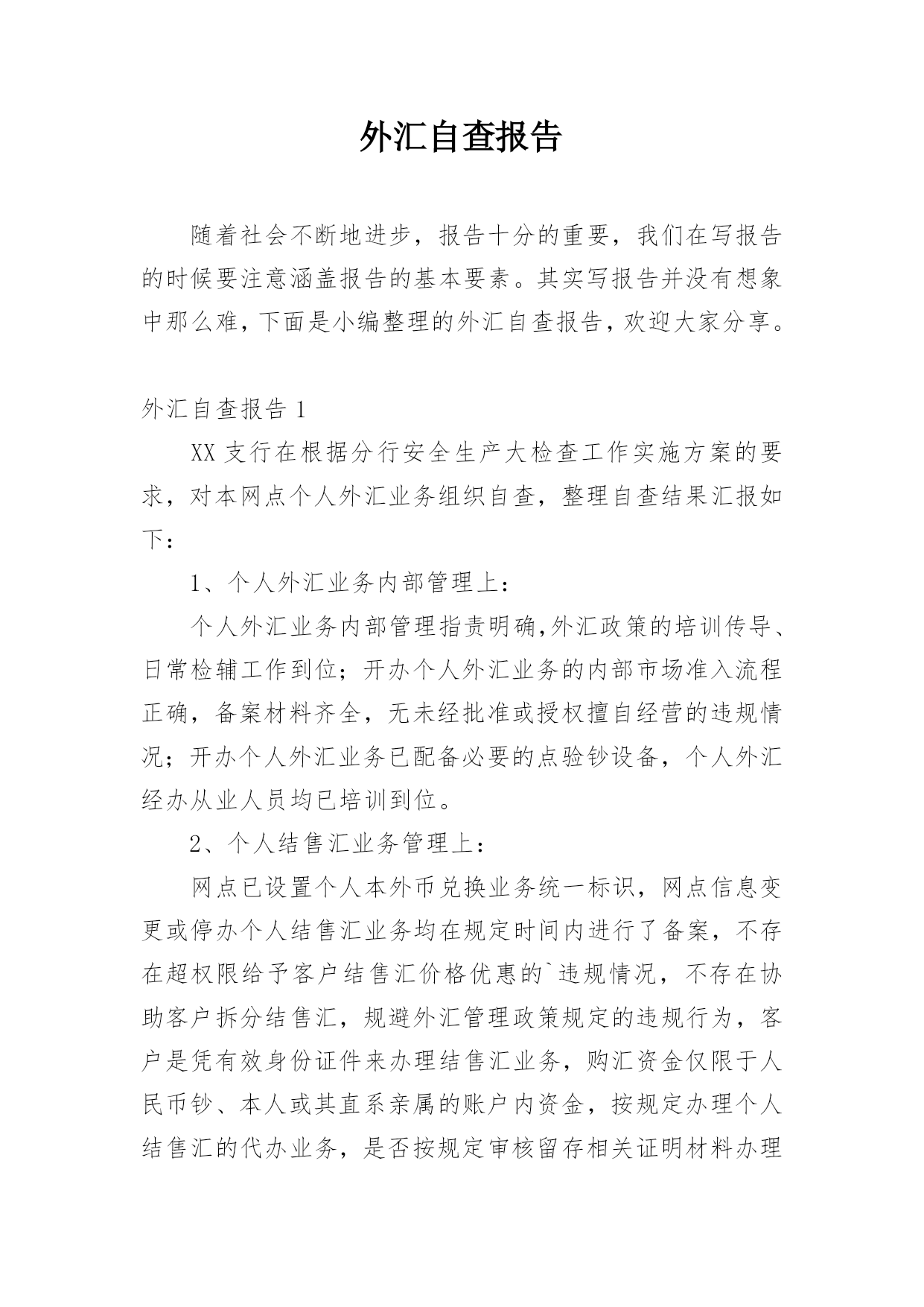 外汇自查报告随着社会不断地进步,报告十分的重要,我们在写报告的时候要注意涵盖报告的基本要素。其实写报告并没有想象中那么难,下面是小编整理的外汇自查报告,欢迎大家分享。外汇自查报告1XX支行在根据分行安全生产大检查工作实施方案的要求,对本网点个人外汇业务组织自查,整理自查结果汇报如下:1、个人外汇业务内部管理上:个人外汇业务内部管理指责明确,外汇政策的培训传导、日常检辅工作到位;开办个人外汇业务的内部市场准入流程正确,备案材料齐全,无未经批准或授权擅自经营的违规情况;开办个人外汇业务已配备必要的点验钞设备,
