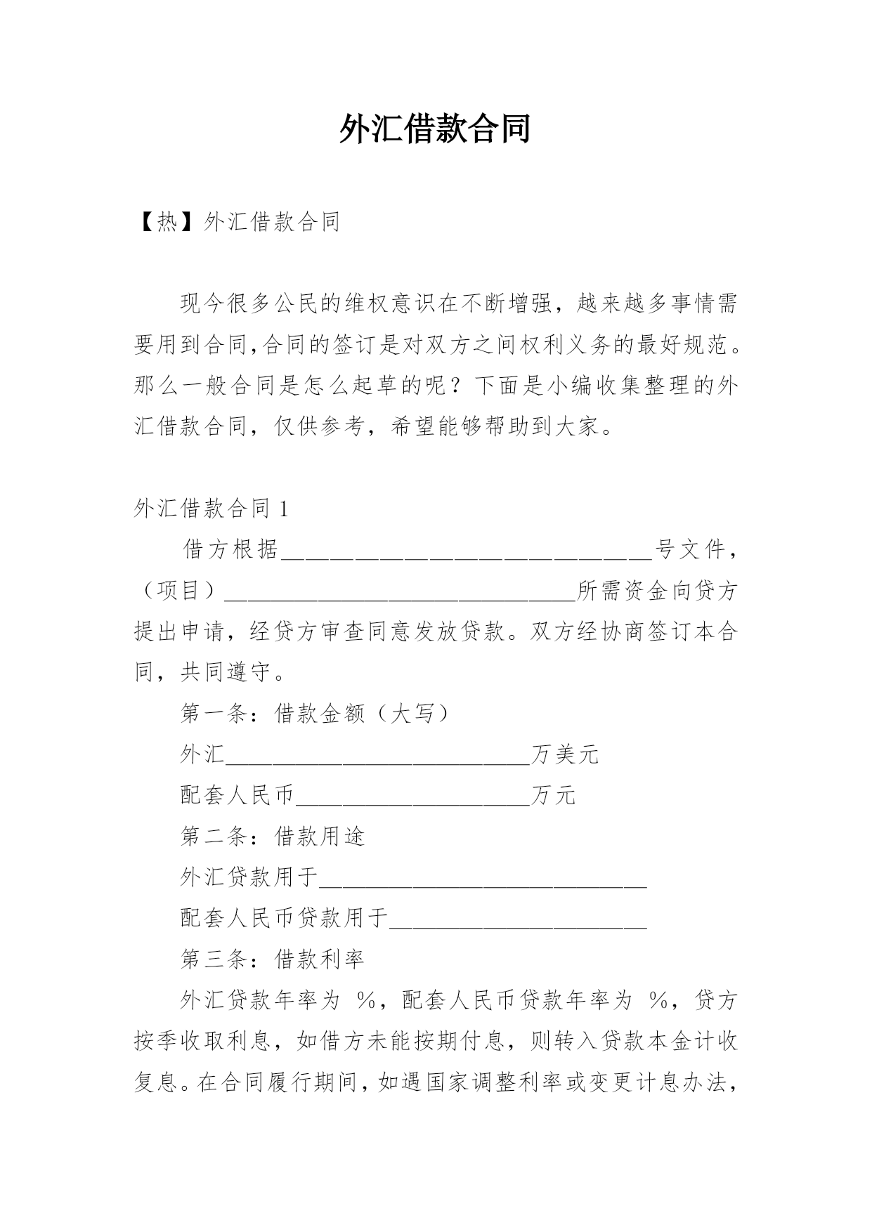 外汇借款合同【热】外汇借款合同现今很多公民的维权意识在不断增强,越来越多事情需要用到合同,合同的签订是对双方之间权利义务的最好规范。那么一般合同是怎么起草的呢?下面是小编收集整理的外汇借款合同,仅供参考,希望能够帮助到大家。外汇借款合同1借方根据_______________号文件,(项目)_______________所需资金向贷方提出申请,经贷方审查同意发放贷款。双方经协商签订本合同,共同遵守。第一条:借款金额(大写)外汇_____________万美元配套人民币__________万元第二条:借款用