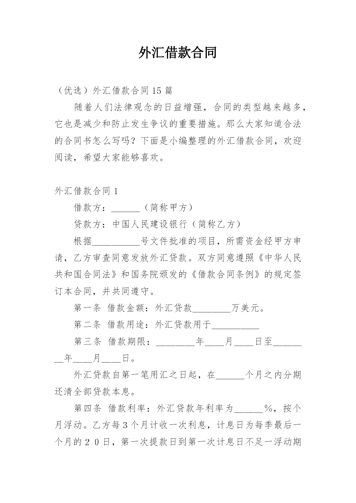外汇借款合同(优选)外汇借款合同15篇随着人们法律观念的日益增强,合同的类型越来越多,它也是减少和防止发生争议的重要措施。那么大家知道合法的合同书怎么写吗?下面是小编整理的外汇借款合同,欢迎阅读,希望大家能够喜欢。外汇借款合同1借款方:___(简称甲方)贷款方:中国人民建设银行(简称乙方)根据_____号文件批准的项目,所需资金经甲方申请,乙方审查同意发放外汇贷款。双方同意遵照《中华人民共和国合同法》和国务院颁发的《借款合同条例》的规定签订本合同,并共同遵守。第一条借款金额:外汇贷款____万美元。第二条