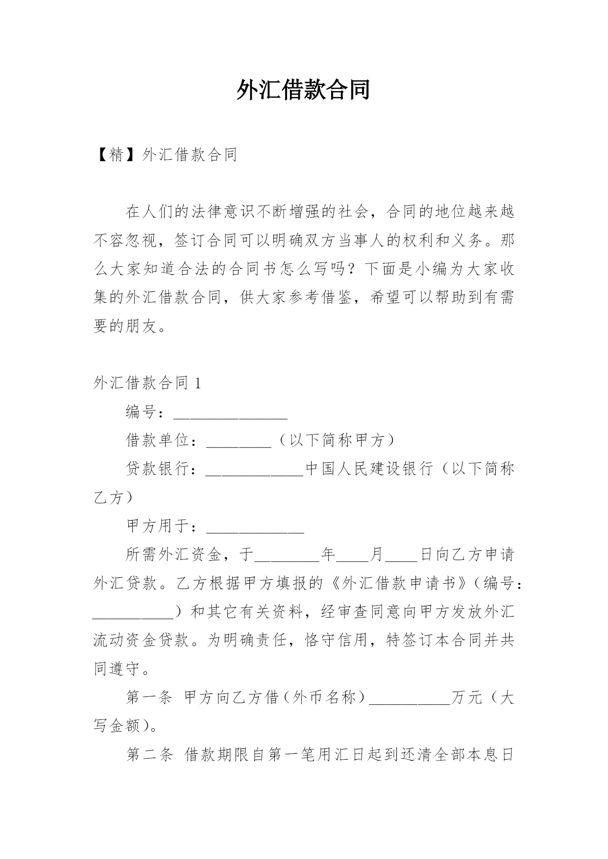 外汇借款合同【精】外汇借款合同在人们的法律意识不断增强的社会,合同的地位越来越不容忽视,签订合同可以明确双方当事人的权利和义务。那么大家知道合法的合同书怎么写吗?下面是小编为大家收集的外汇借款合同,供大家参考借鉴,希望可以帮助到有需要的朋友。外汇借款合同1编号:_______借款单位:____(以下简称甲方)贷款银行:______中国人民建设银行(以下简称乙方)甲方用于:______所需外汇资金,于____年__月__日向乙方申请外汇贷款。乙方根据甲方填报的《外汇借款申请书》(编号:_____)和其它有关