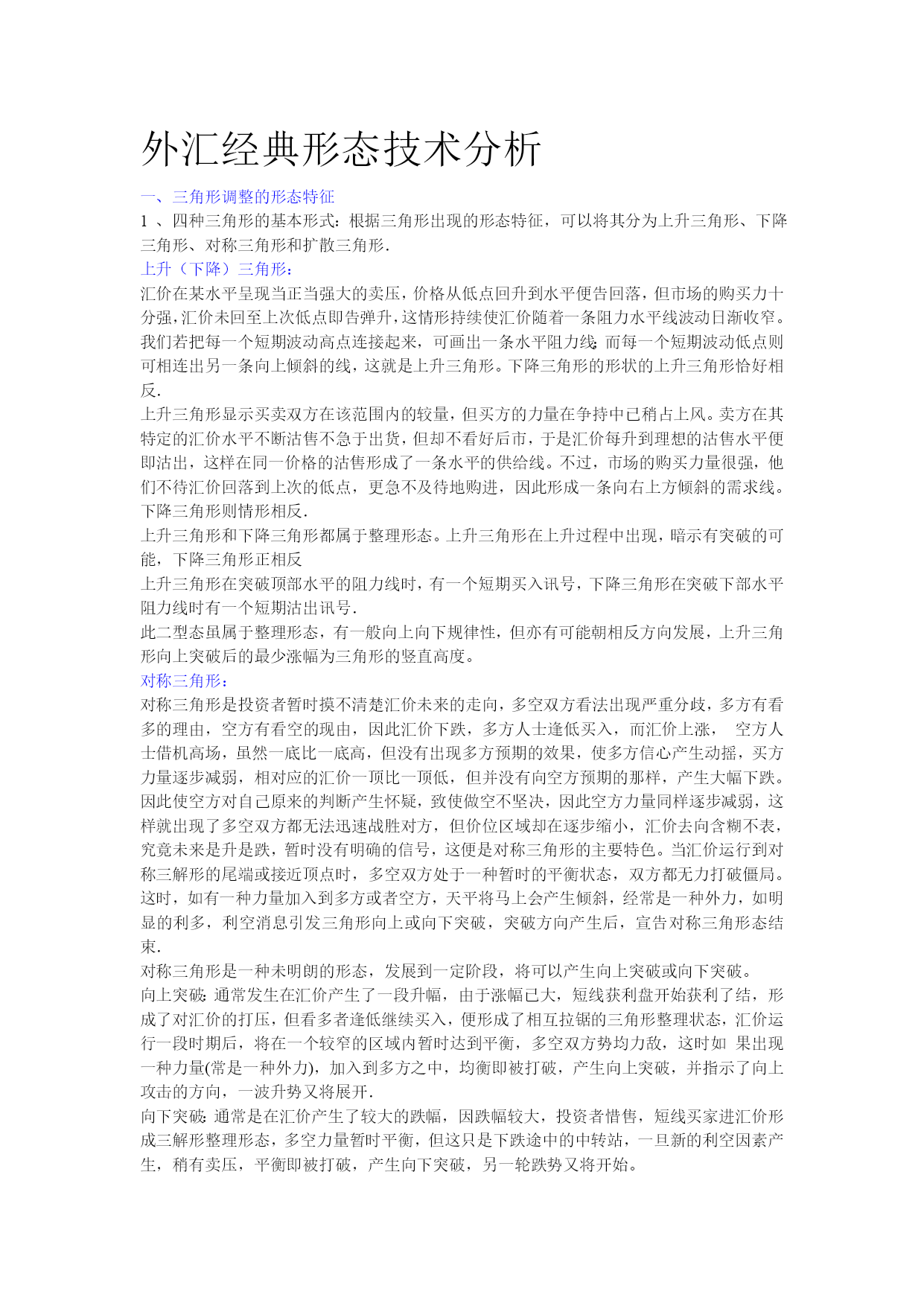 外汇经典形态技术分析一、三角形调整的形态特征1、四种三角形的基本形式:根据三角形出现的形态特征,可以将其分为上升三角形、下降三角形、对称三角形和扩散三角形.上升(下降)三角形:汇价在某水平呈现当正当强大的卖压,价格从低点回升到水平便告回落,但市场的购买力十分强,汇价未回至上次低点即告弹升,这情形持续使汇价随着一条阻力水平线波动日渐收窄。我们若把每一个短期波动高点连接起来,可画出一条水平阻力线;而每一个短期波动低点则可相连出另一条向上倾斜的线,这就是上升三角形。下降三角形的形状的上升三角形恰好相反.上升三角