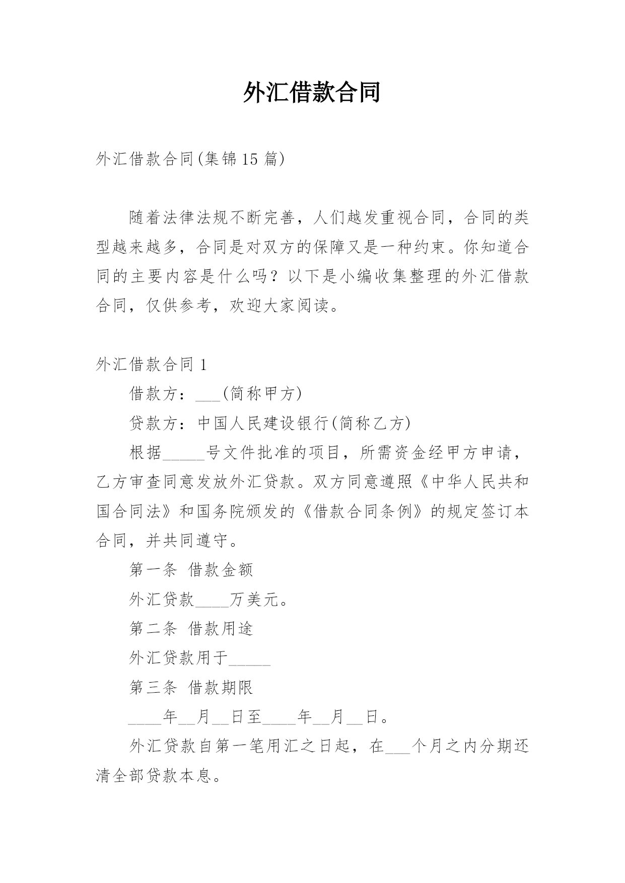 外汇借款合同外汇借款合同(集锦15篇)随着法律法规不断完善,人们越发重视合同,合同的类型越来越多,合同是对双方的保障又是一种约束。你知道合同的主要内容是什么吗?以下是小编收集整理的外汇借款合同,仅供参考,欢迎大家阅读。外汇借款合同1借款方:___(简称甲方)贷款方:中国人民建设银行(简称乙方)根据_____号文件批准的项目,所需资金经甲方申请,乙方审查同意发放外汇贷款。双方同意遵照《中华人民共和国合同法》和国务院颁发的《借款合同条例》的规定签订本合同,并共同遵守。第一条借款金额外汇贷款____万美元。第二