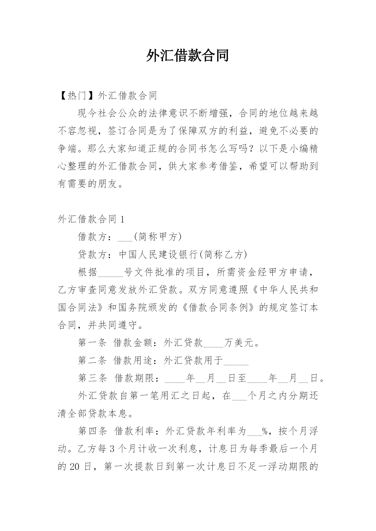 外汇借款合同【热门】外汇借款合同现今社会公众的法律意识不断增强,合同的地位越来越不容忽视,签订合同是为了保障双方的利益,避免不必要的争端。那么大家知道正规的合同书怎么写吗?以下是小编精心整理的外汇借款合同,供大家参考借鉴,希望可以帮助到有需要的朋友。外汇借款合同1借款方:___(简称甲方)贷款方:中国人民建设银行(简称乙方)根据_____号文件批准的项目,所需资金经甲方申请,乙方审查同意发放外汇贷款。双方同意遵照《中华人民共和国合同法》和国务院颁发的《借款合同条例》的规定签订本合同,并共同遵守。第一条借款